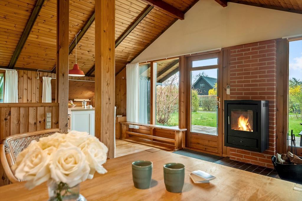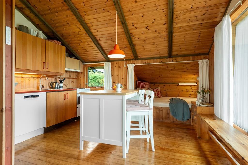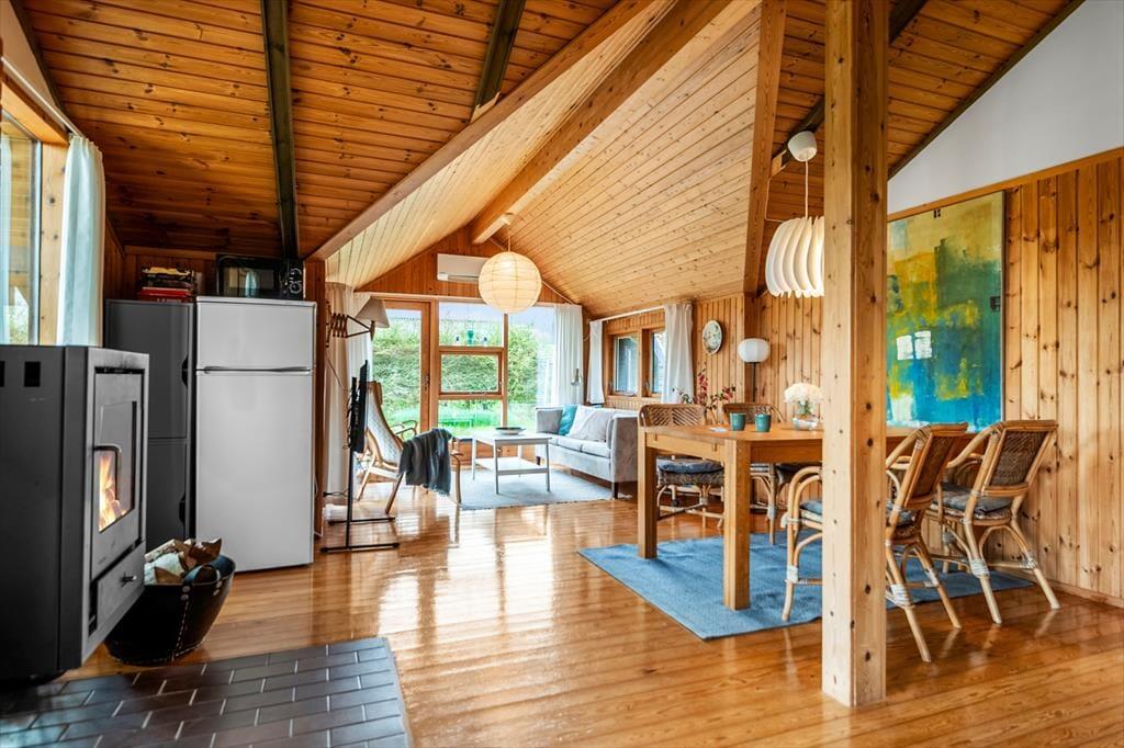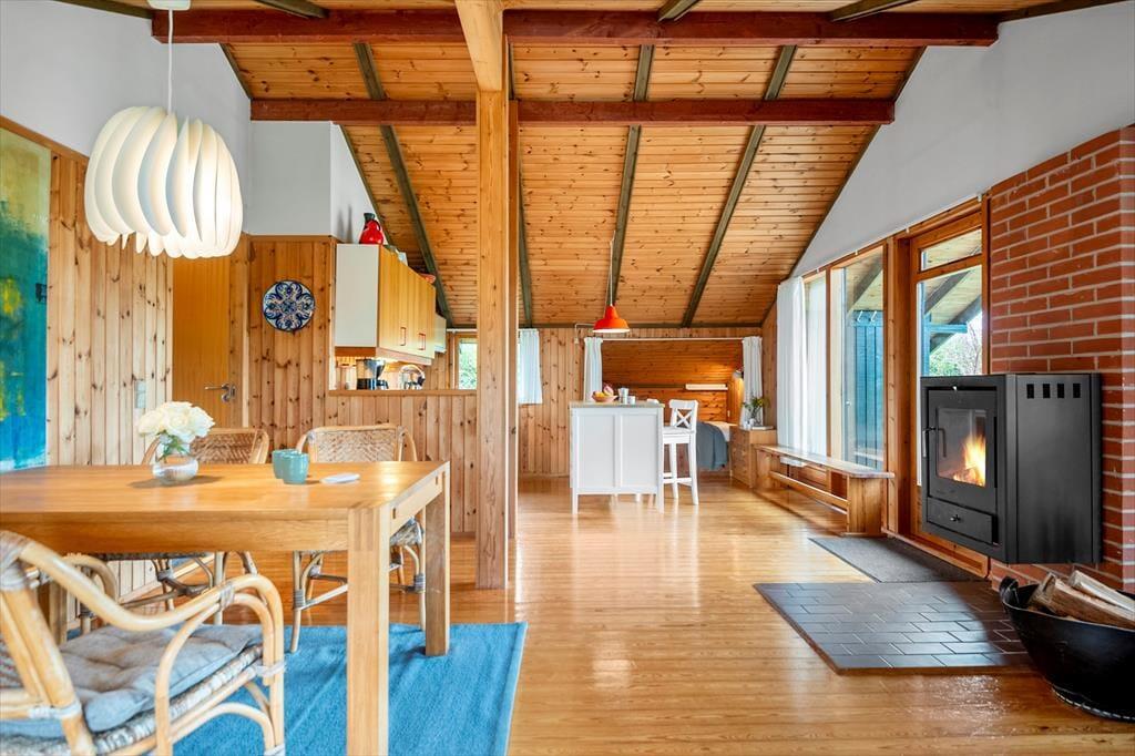 Husets indre byder på en autentisk og hjemlig atmosfære med klassiske sommerhusmaterialer og varme detaljer. I det åbne opholdsrum er der god plads til fællesstunder – her kan du samle familien til måltider omkring spisebordet, spille et brætspil eller blot nyde stilheden. I hjørnet står en alkove, der indbyder til stille stunder med en kop te og en god bog – eller måske en lur i skyggen midt på dagen.