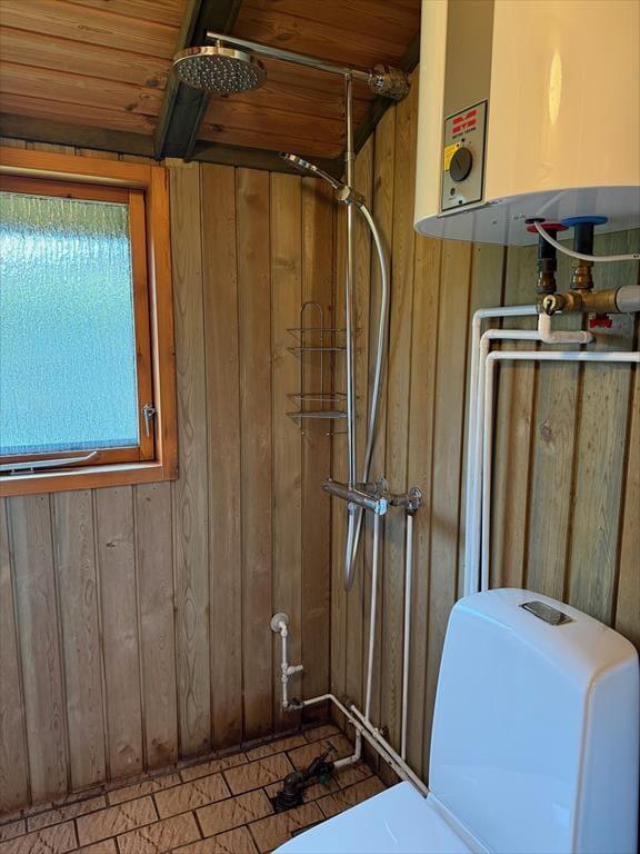 BruserÆldre badeværelse med synlige rør i brusebadet