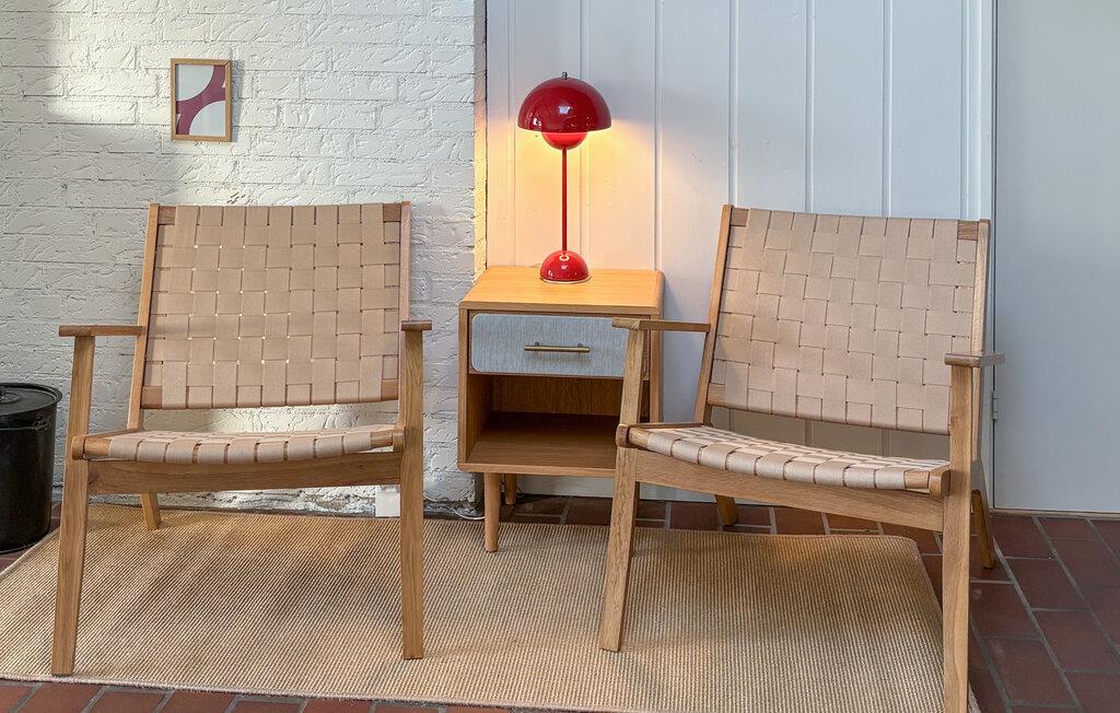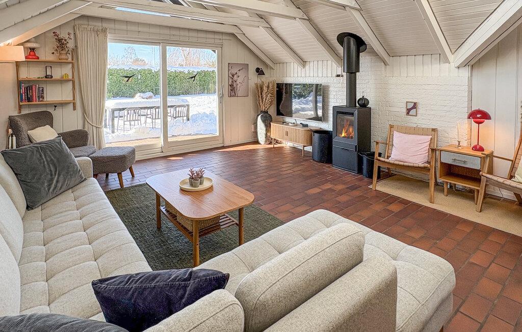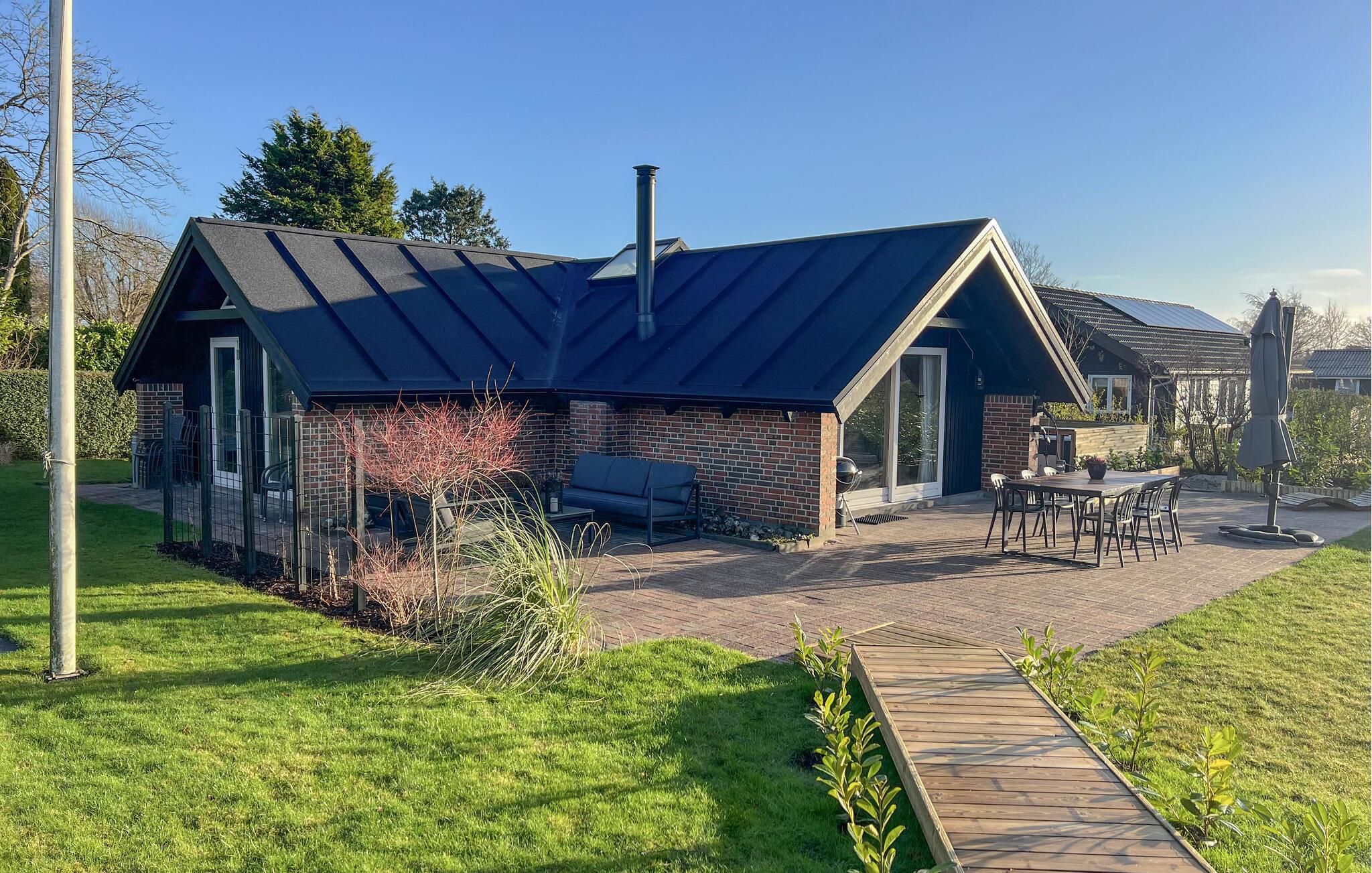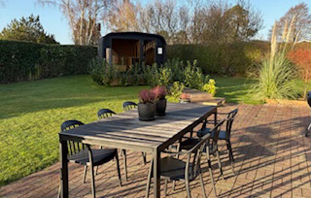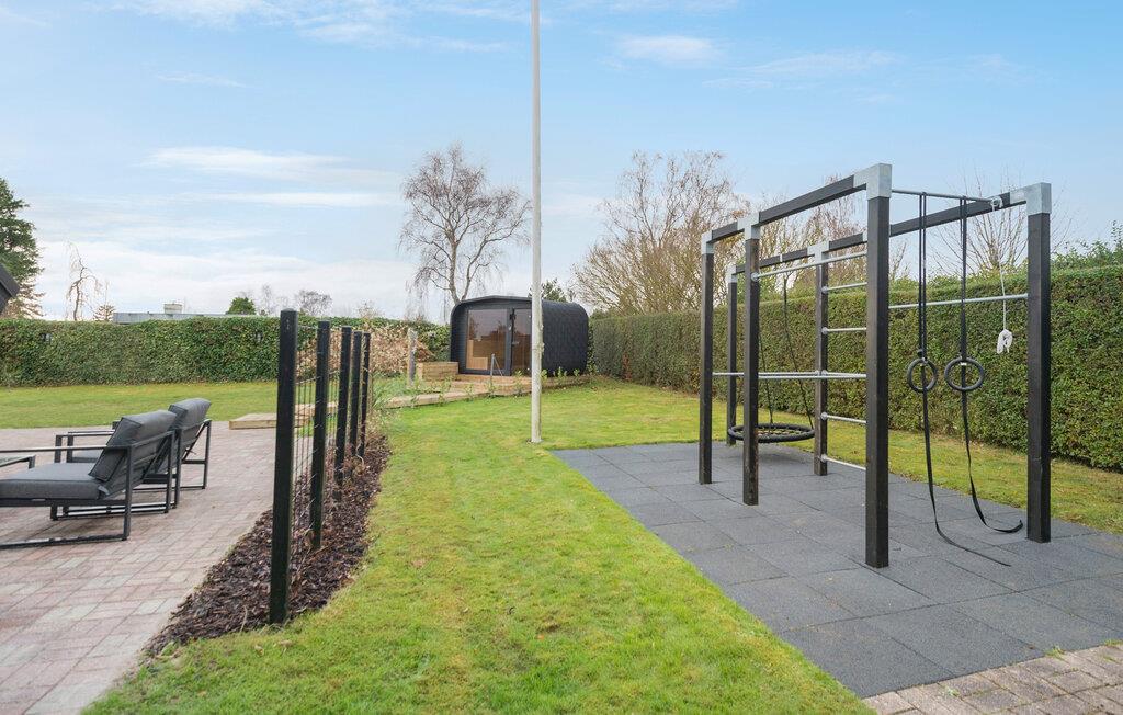 Dette unikke feriehus er noget særligt med sin særprægede arkitektur og et lysfyldt indre. Synlige loftsbjælker, ovenlysvinduer og dekorative detaljer skaber en helt særlig atmosfære. Nyd afslappende stunder ved brændeovnen, eller forkæl jer selv i den rummelige sauna med panoramavindue ud mod haven. Spabadet på terrassen lægger op til ren afslapning, mens lege- og fitnessområdet i haven sørger for bevægelse og sjov. De forskellige terrasser giver jer perfekte rammer til både grillhygge og afslapning.