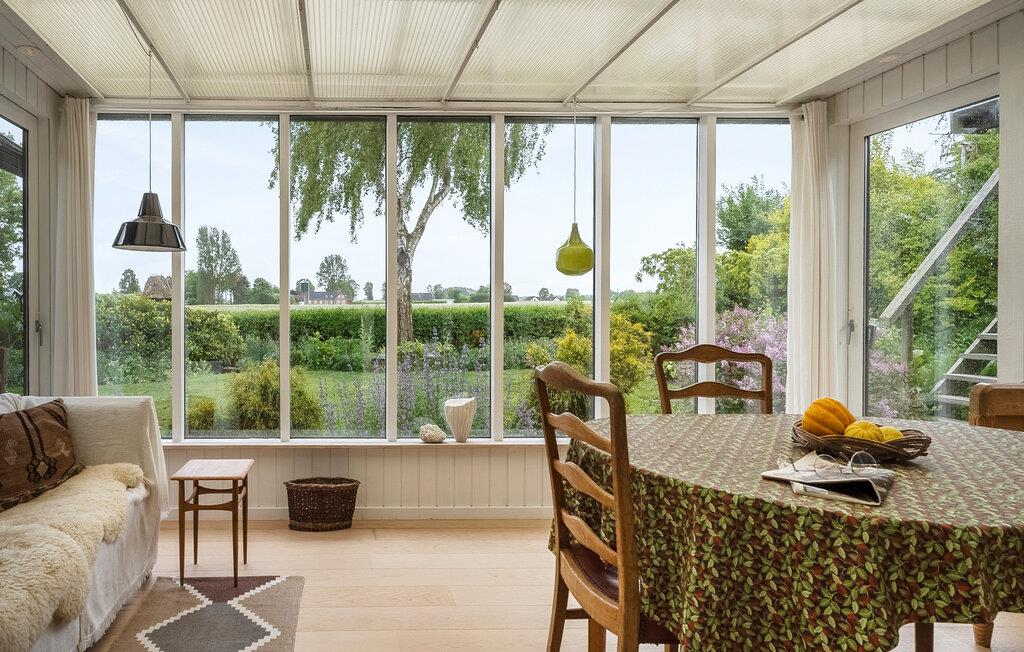 Hold jeres ferie i dette feriehus med udsigt over grønne områder og en hyggelig udestue.