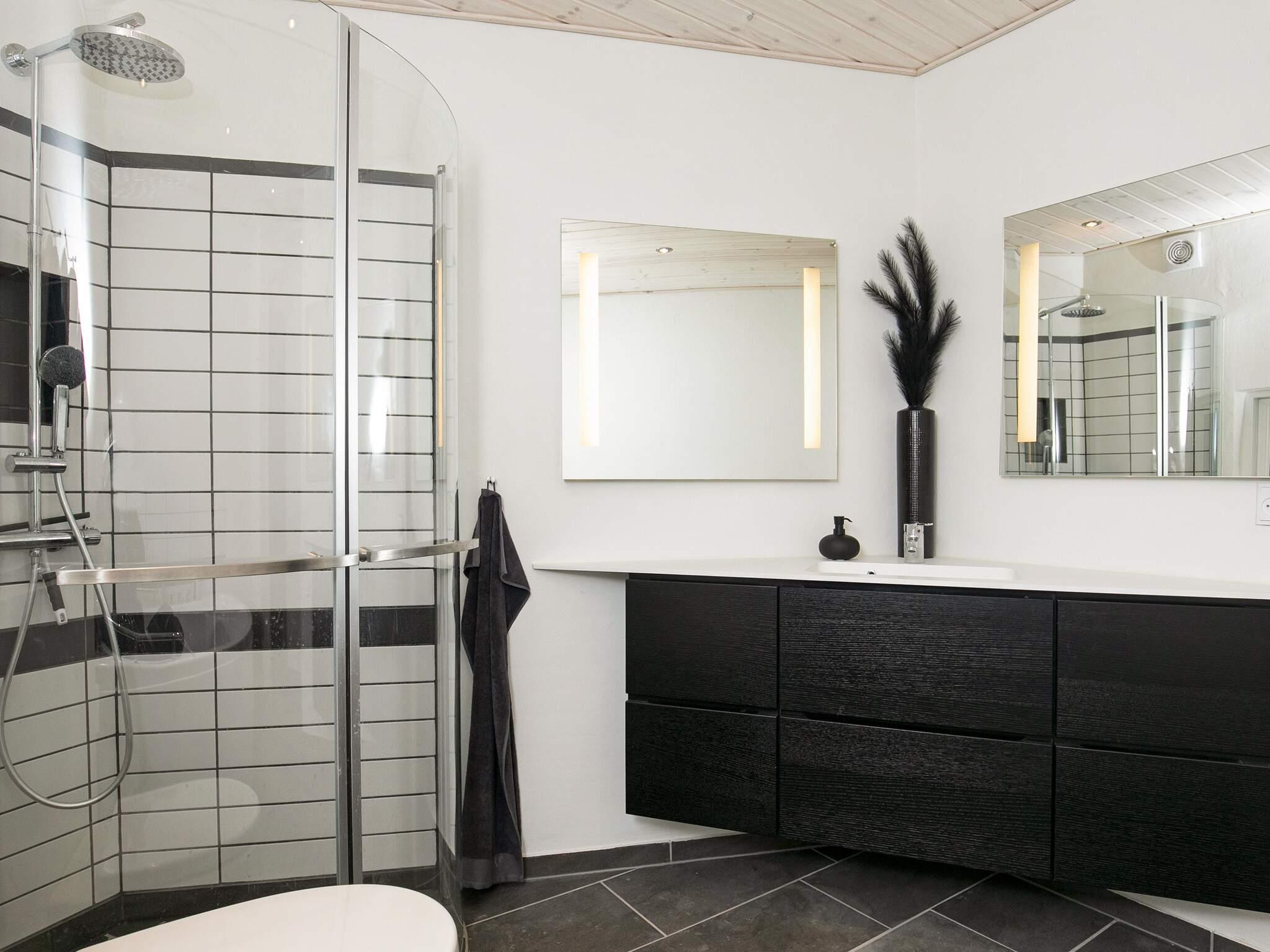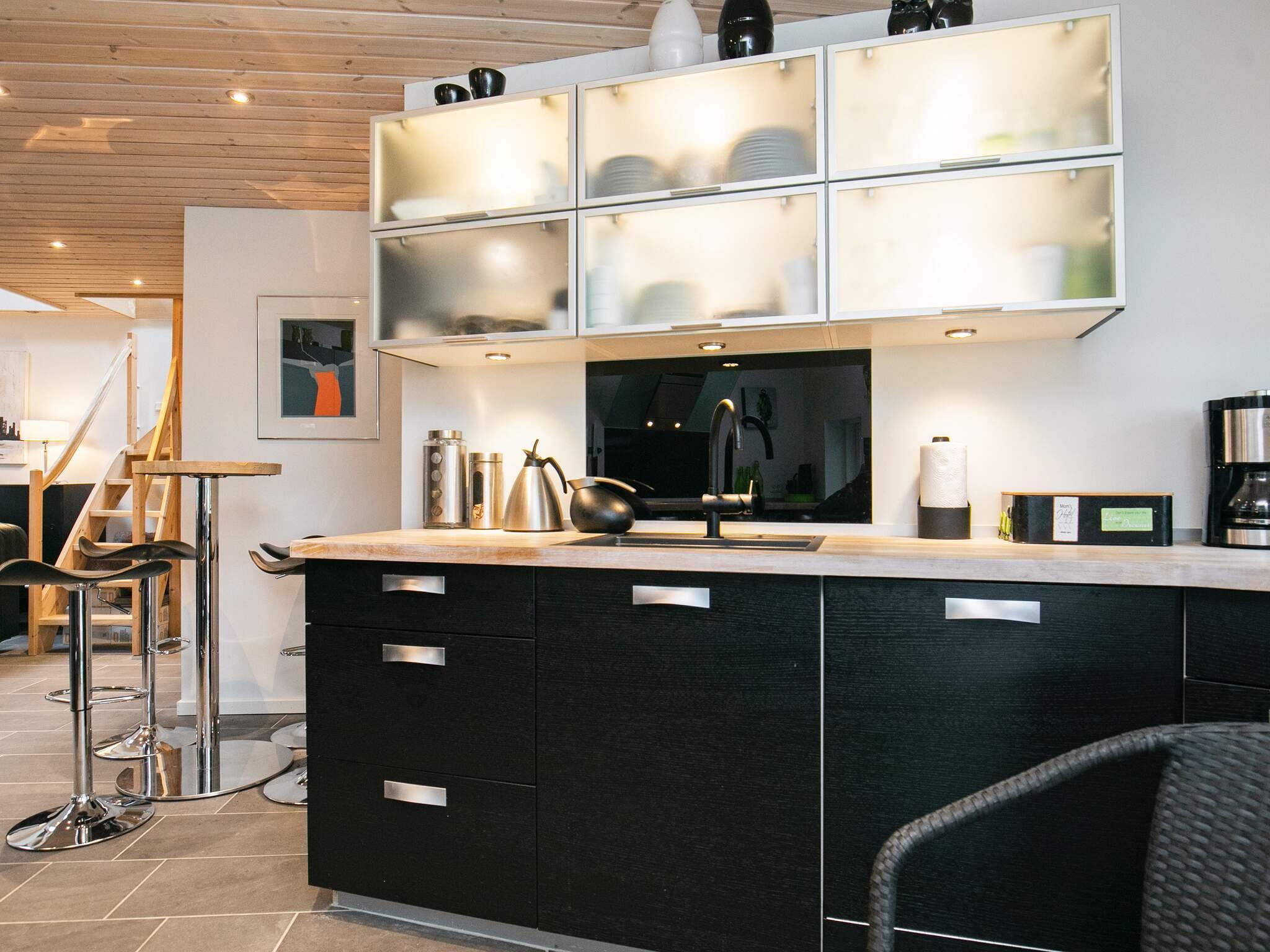 Der er to badeværelser med bruseniche og gulvvarme, hvoraf det ene er med spabad til hyggelige stunder. Sommerhusets hjerterum udgøres af et stort og åbent opholdsrum med god akustik i forbindelse med det godt udstyrede køkken. Her er plads til at alle kan mødes og hygge med madlavning, måltider, spil, en god film eller hvad humøret nu lige dikterer. I stuen er der brændeovn. Rummet har flere vinduer og to ovenlysvinduer, hvor det fascinerende lys strømmer ind, og på de varme dage kan I lukke op til terrassen.