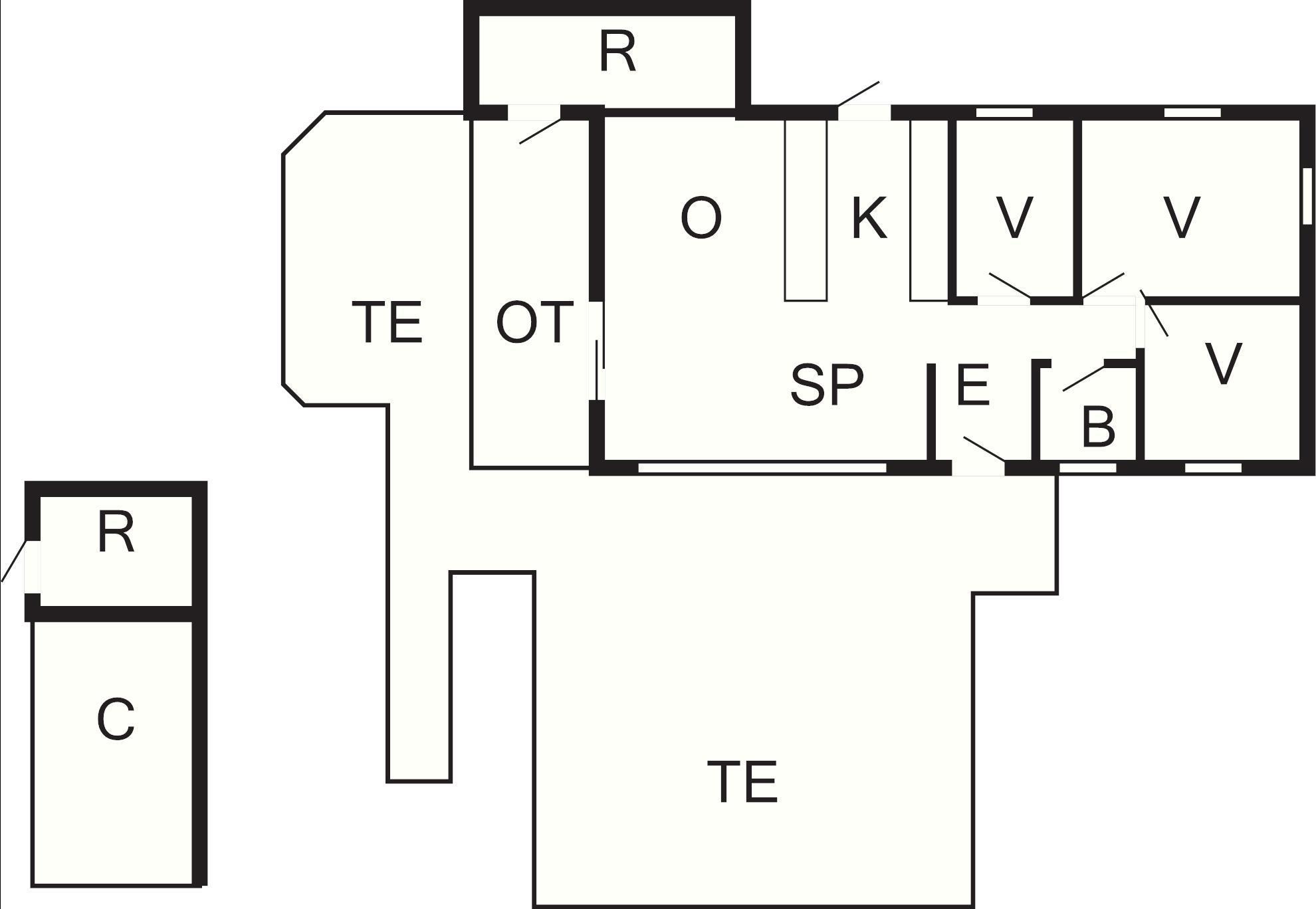 Huset indeholder en stor stue i åben forbindelse med køkkenet og med store vinduer ud mod haven, som giver et godt lysindfald. Der er rummelig entre, tre soveværelser med skabsplads samt badeværelse med brus. Den ene dobbelseng er en 1 1/2 mands seng. Der er gode terrasser rundt om det meste af huset, som gør, det altid er muligt at finde sol ved huset. Desuden er der carport.