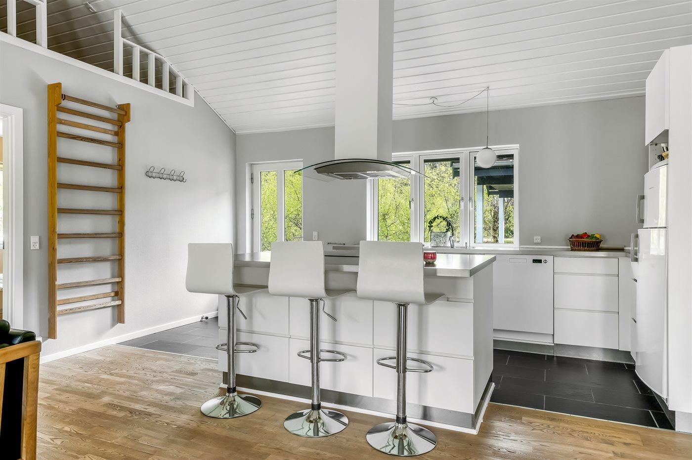 Køkkenet er udstyret med 1 køleskab. Der er 4 induktionskogeplader, varmluftovn, mikrobølgeovn samt opvaskemaskine.