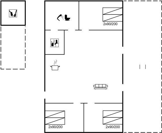 Bemærk, at de 3 sovepladser på madrasser befinder sig på husets hems.