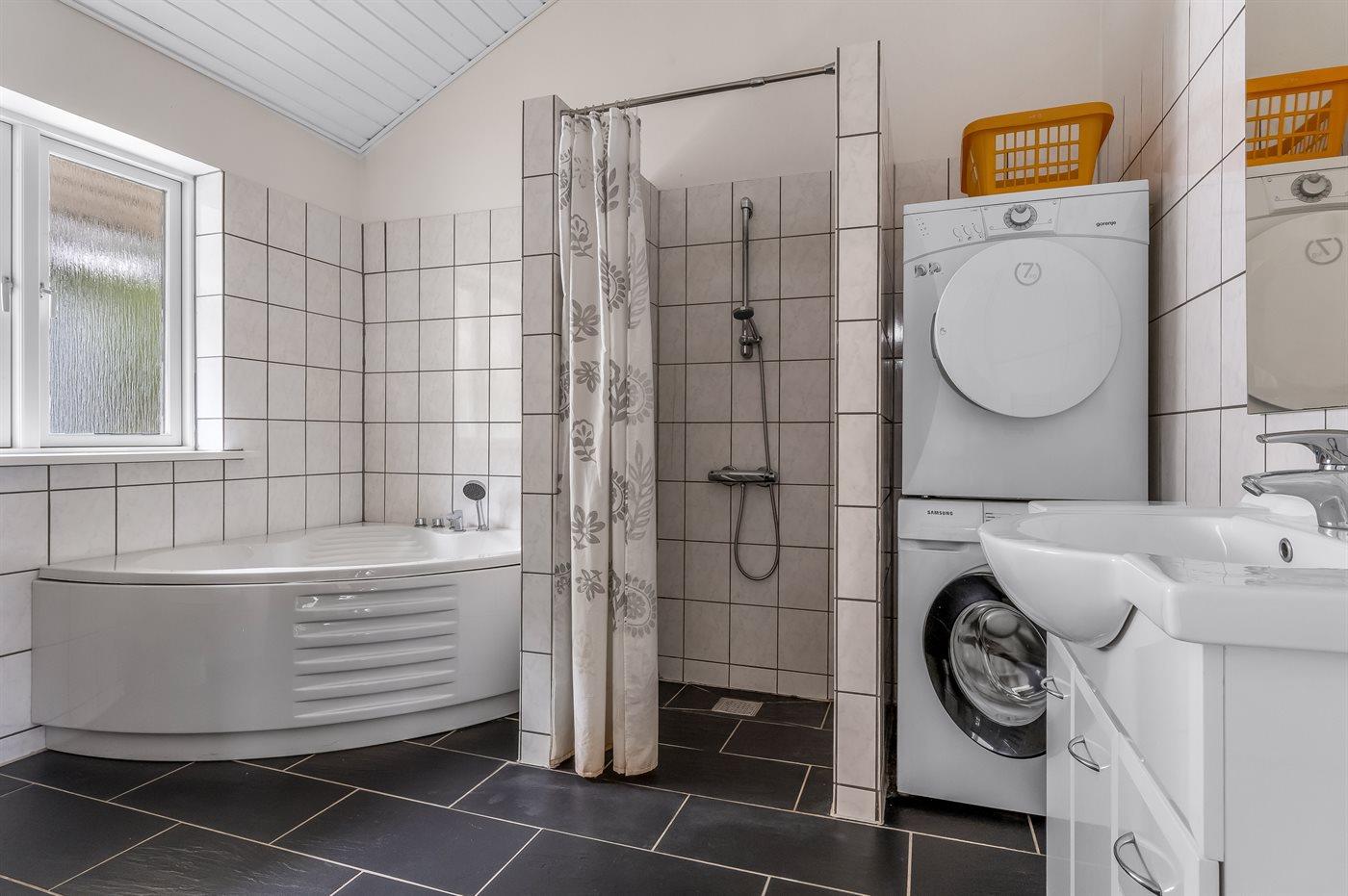 Der er 1 badeværelse med bruseniche og 1 toilet.. Der er gulvvarme på 1 badeværelse.. Badekar. I saunaen er der mulighed for afslapning.