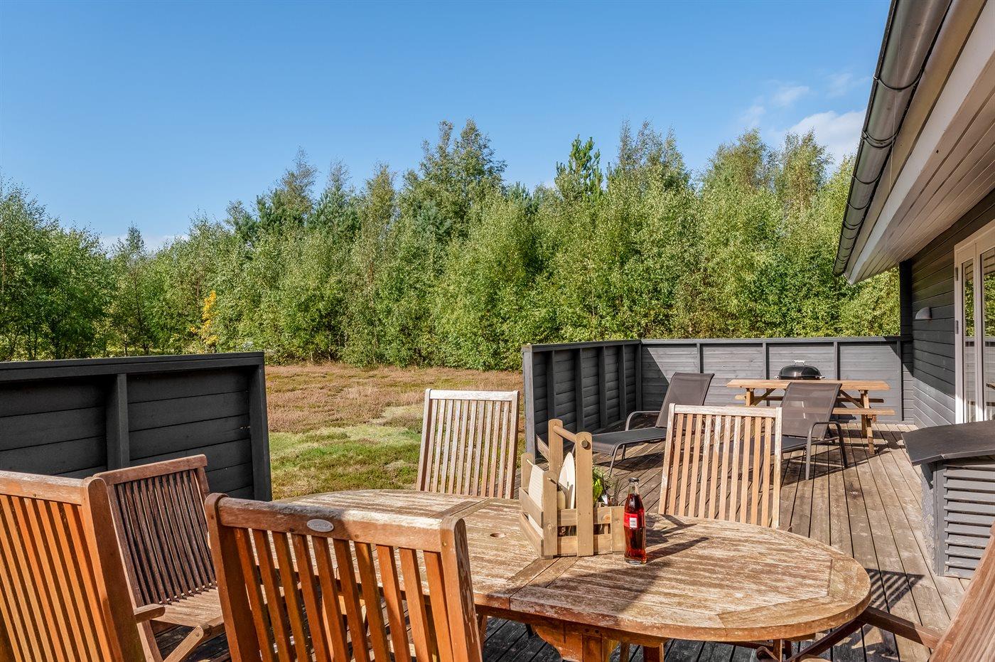 Ferieboligen er beliggende på en 1500 m² stor havegrund. naturgrund. Der er 300 m til havet. Nærmeste forretning er beliggende i en afstand af 700 m. Der er en golfbane i en afstand af 2500 m. Til ferieboligen hører 52 m² terrasseareal. Der er redskabsrum. Der er carport til rådighed. Der er installeret stik til opladning af elbil. Parkering ved ferieboligen.