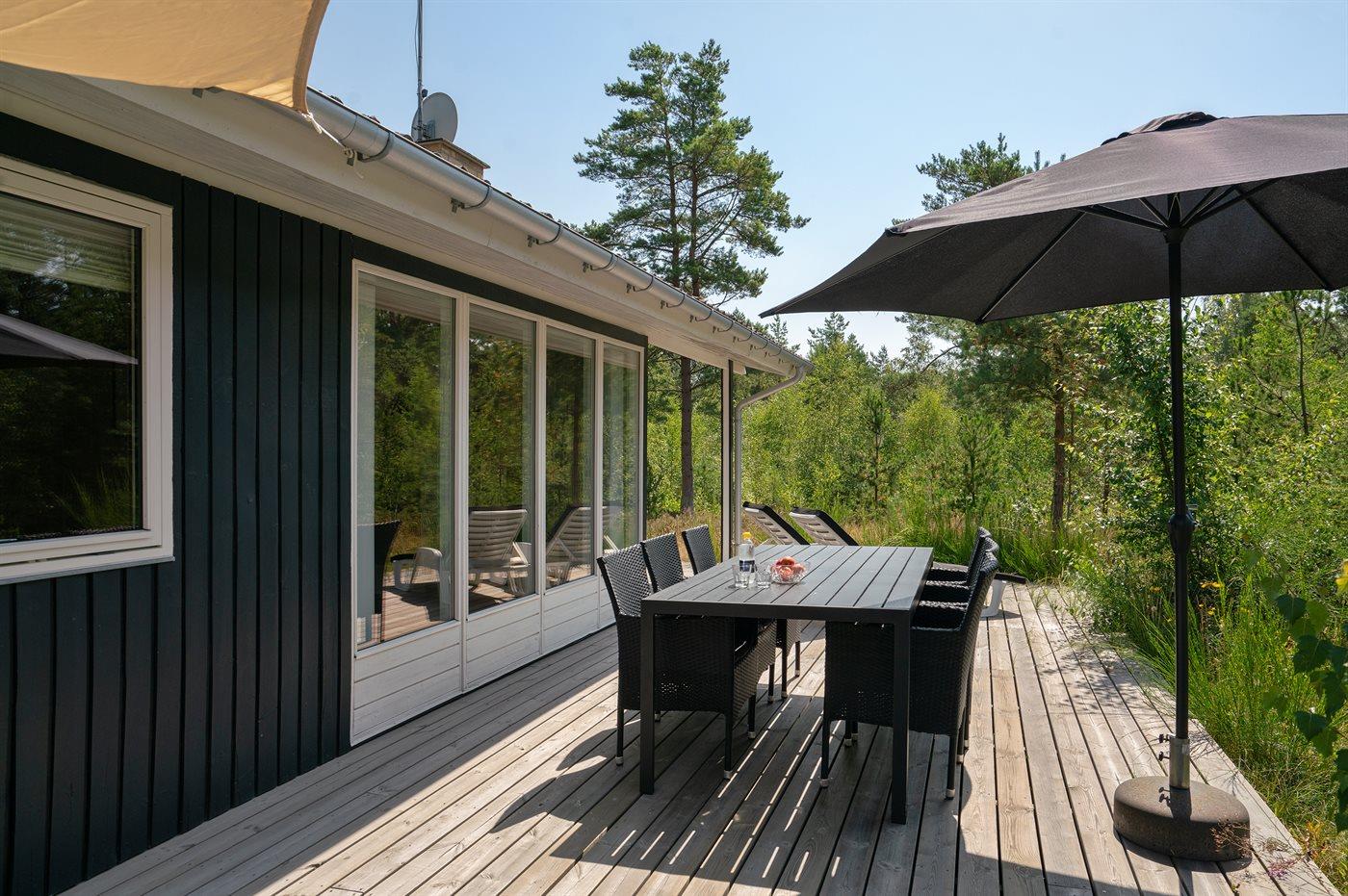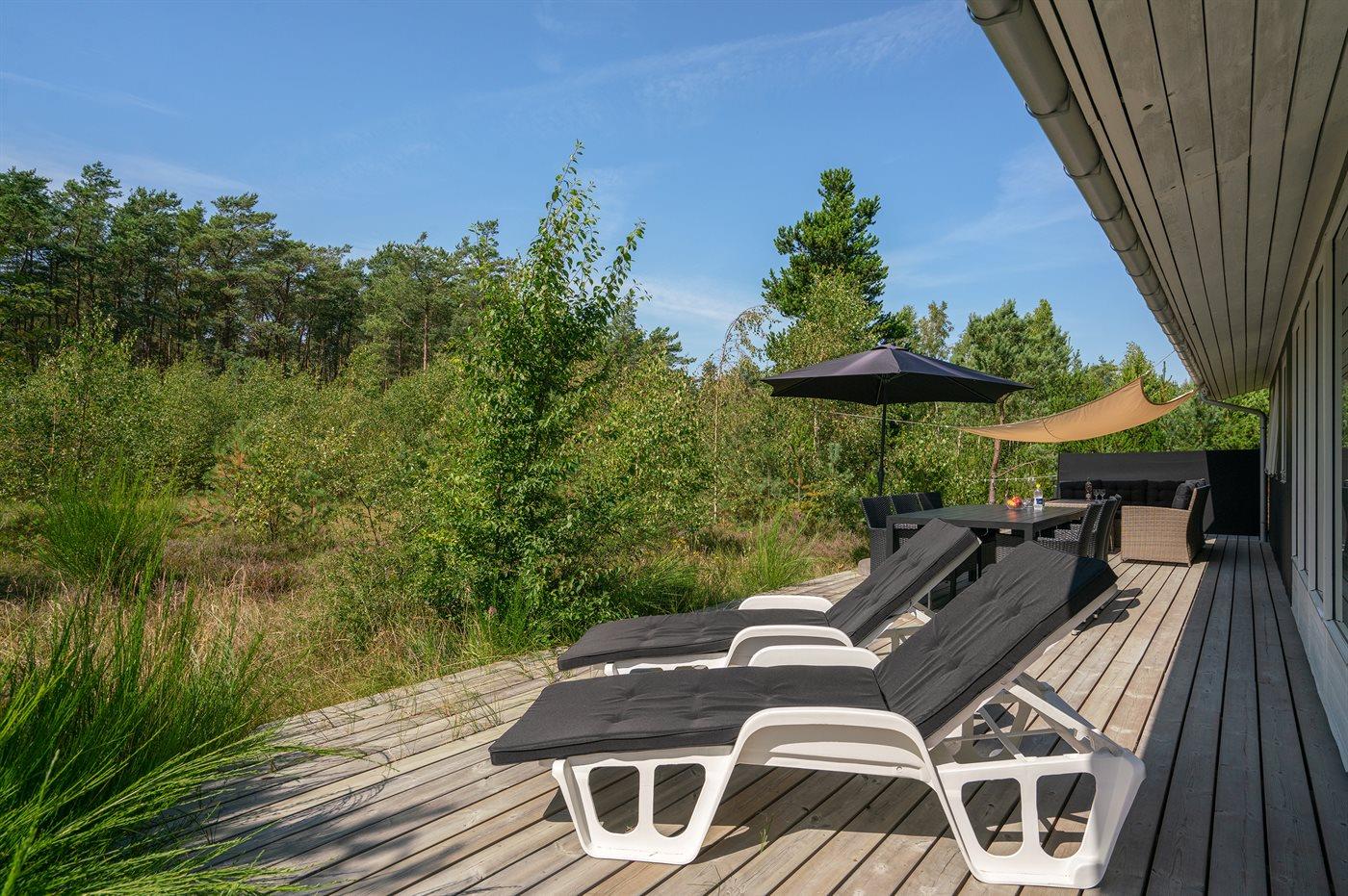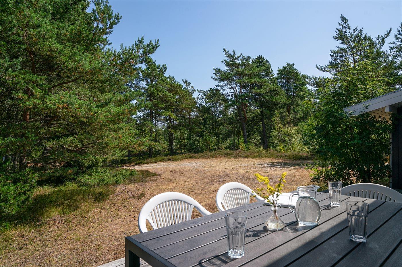 Ferieboligen er beliggende på en 5090 m² stor naturgrund. Der er 600 m til havet. Nærmeste forretning er beliggende i en afstand af 900 m. Der er en golfbane i en afstand af 3500 m. Til ferieboligen hører 70 m² terrasseareal. Desuden er der 20 m² overdækket terrasse. Der er redskabsrum. Der findes ny Weber gasgrill. Parkering ved ferieboligen.