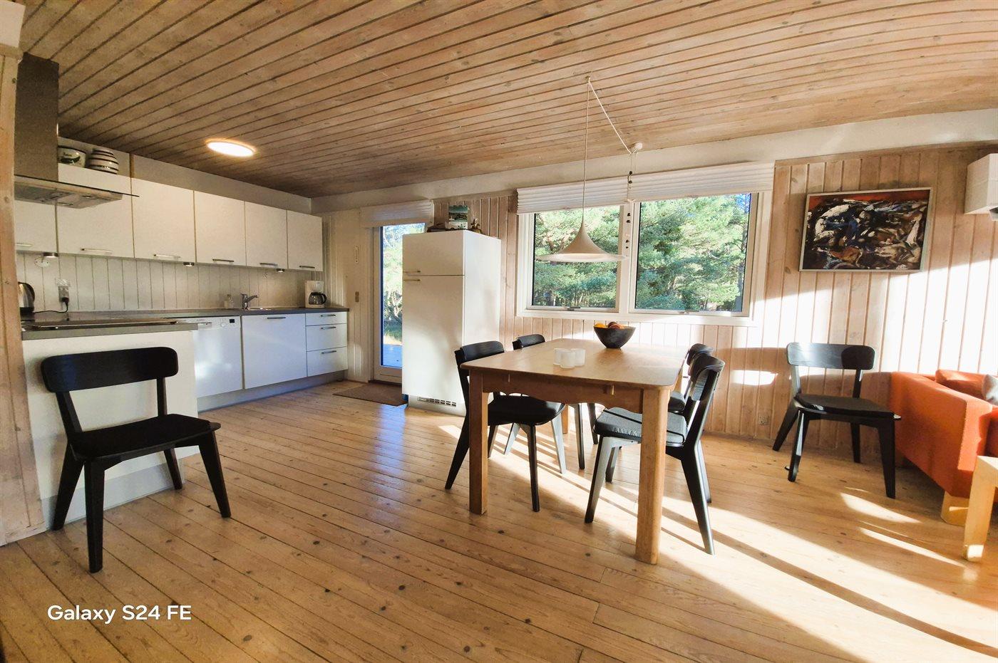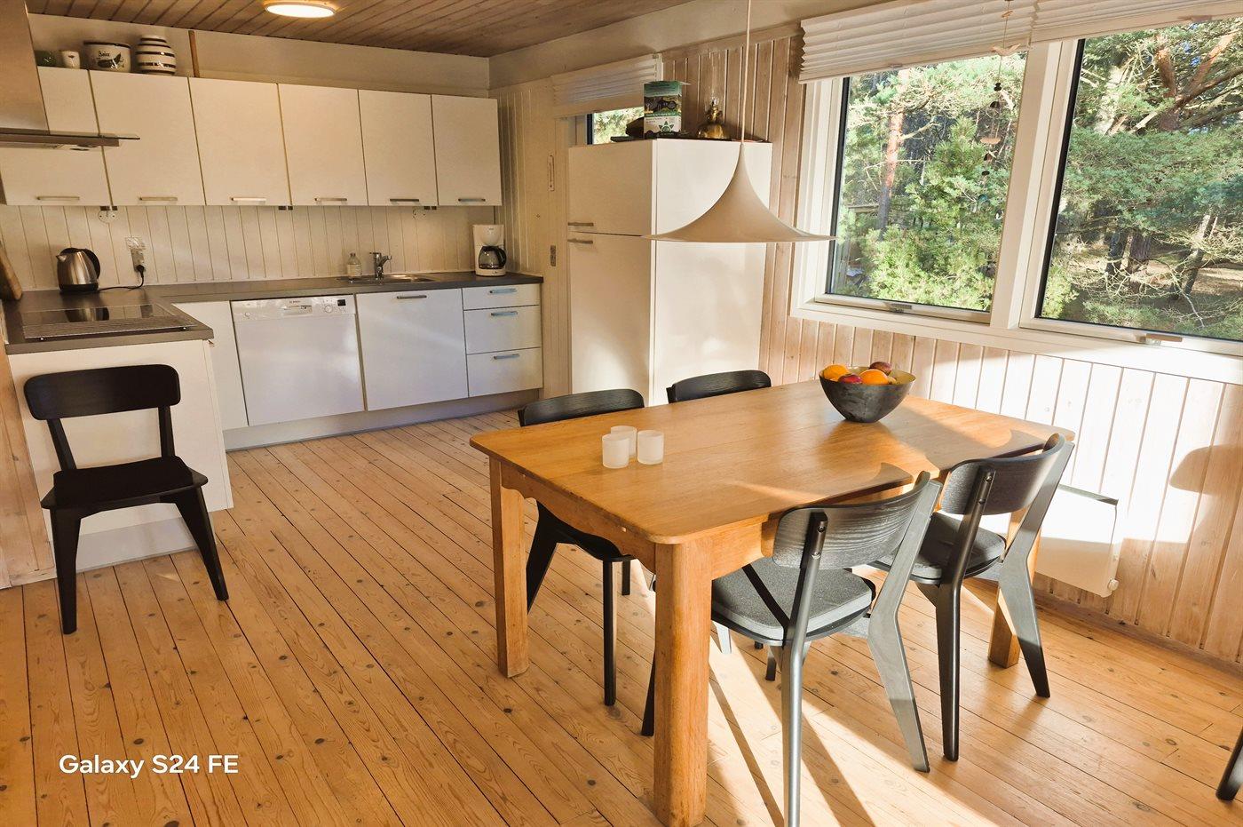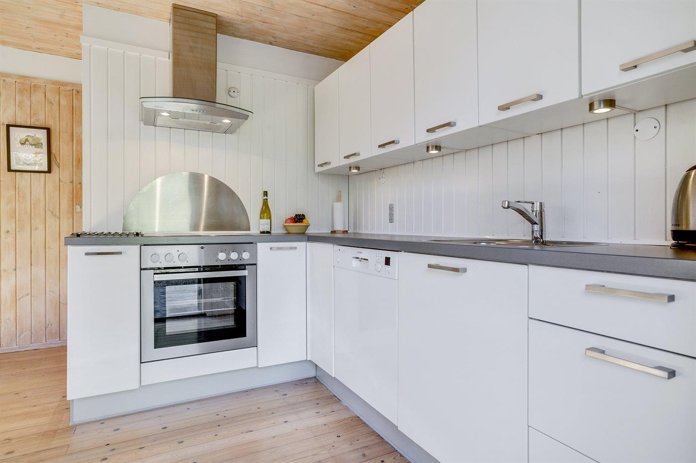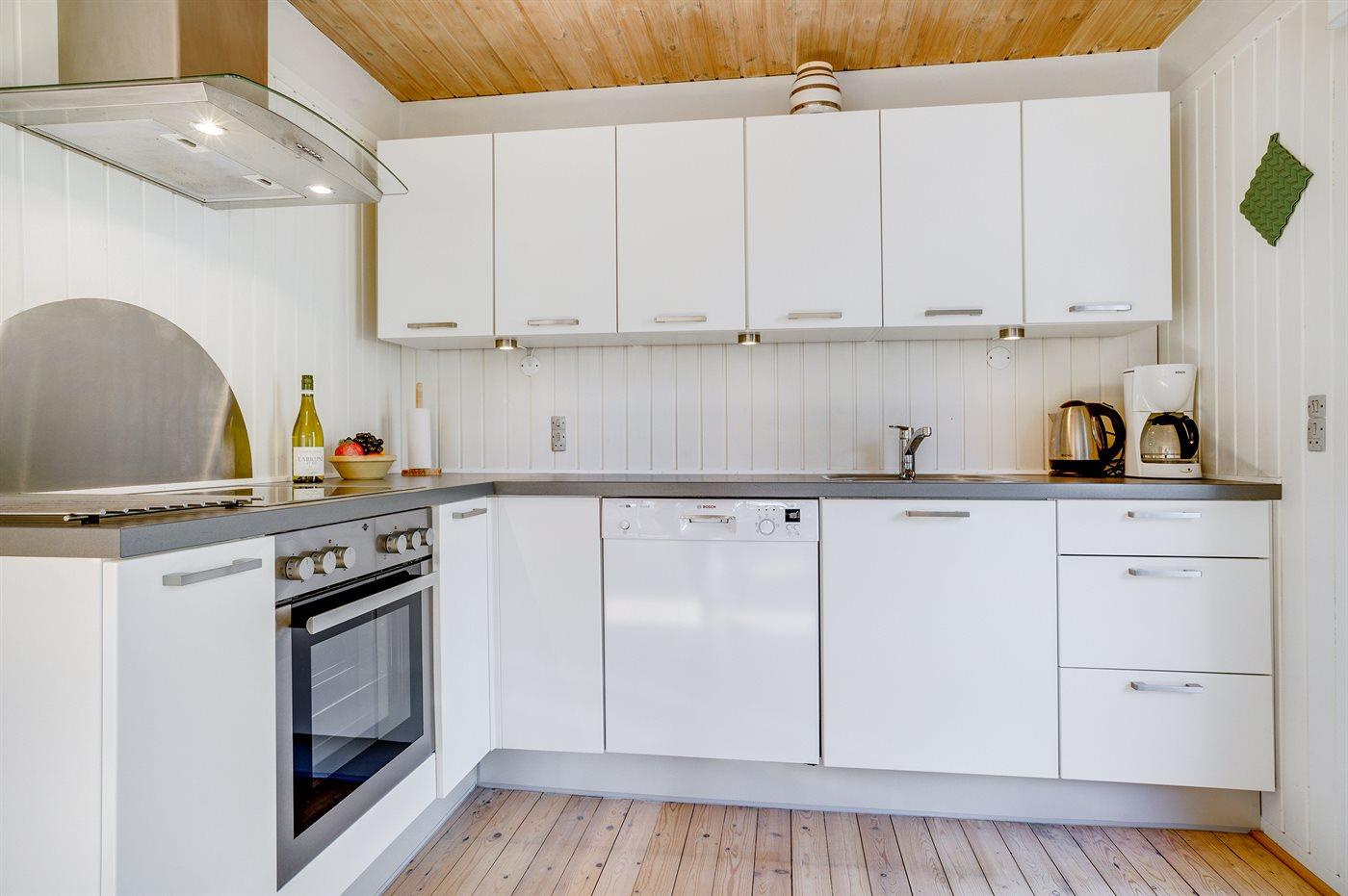 Køkkenet er udstyret med 1 køleskab. Der er 4 keramiske kogeplader, varmluftovn samt opvaskemaskine.
