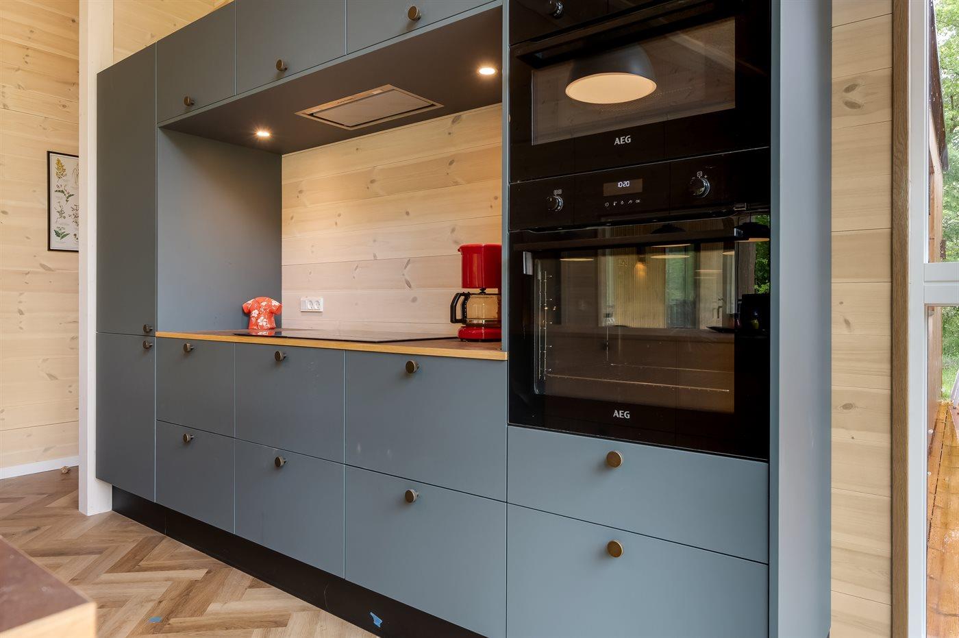 Køkkenet er udstyret med 1 køleskab. Der er 4 induktionskogeplader, varmluftovn, mikrobølgeovn samt opvaskemaskine.