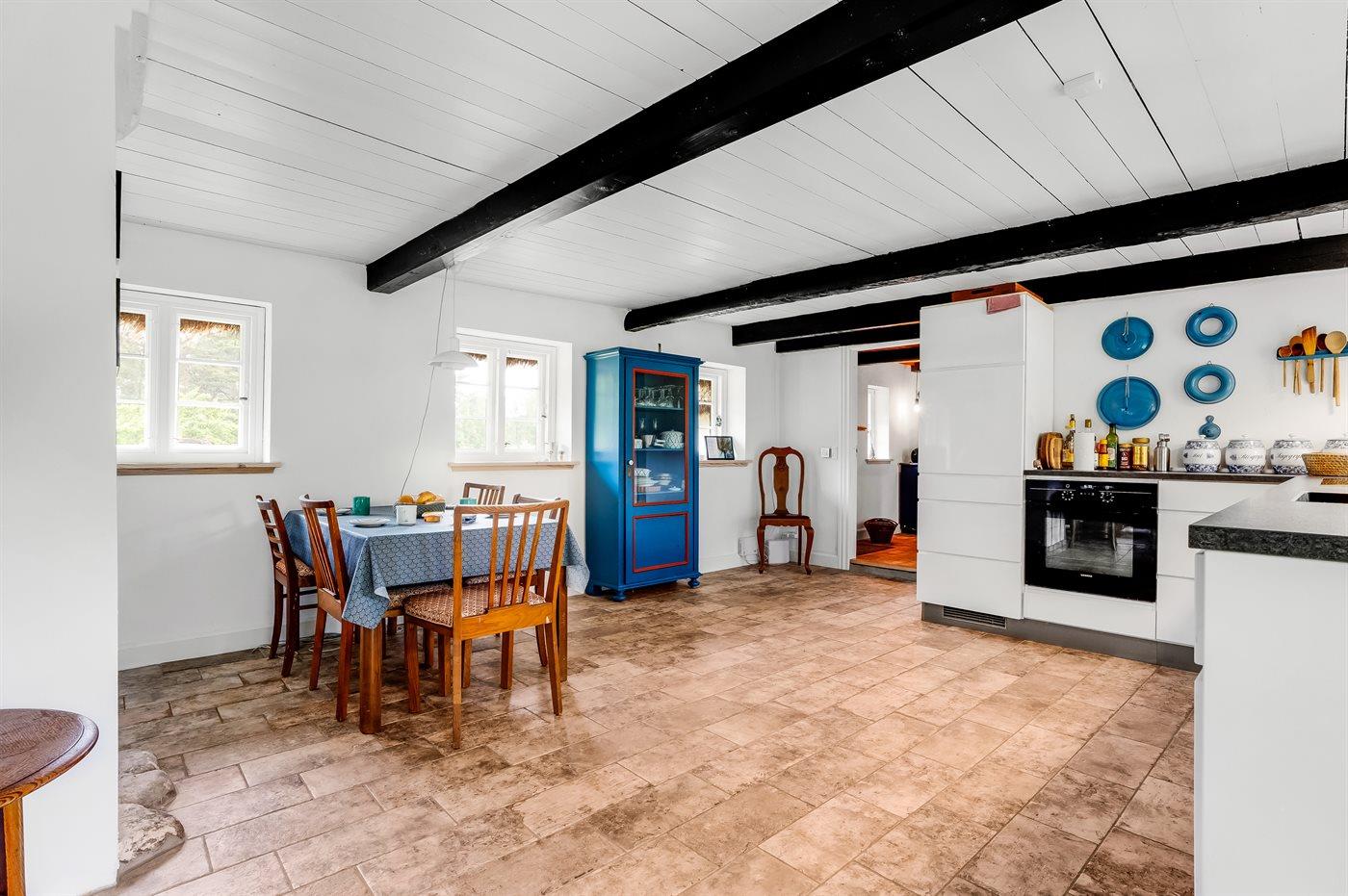 Køkkenet er udstyret med 1 køleskab. Der er 4 induktionskogeplader, varmluftovn samt opvaskemaskine.