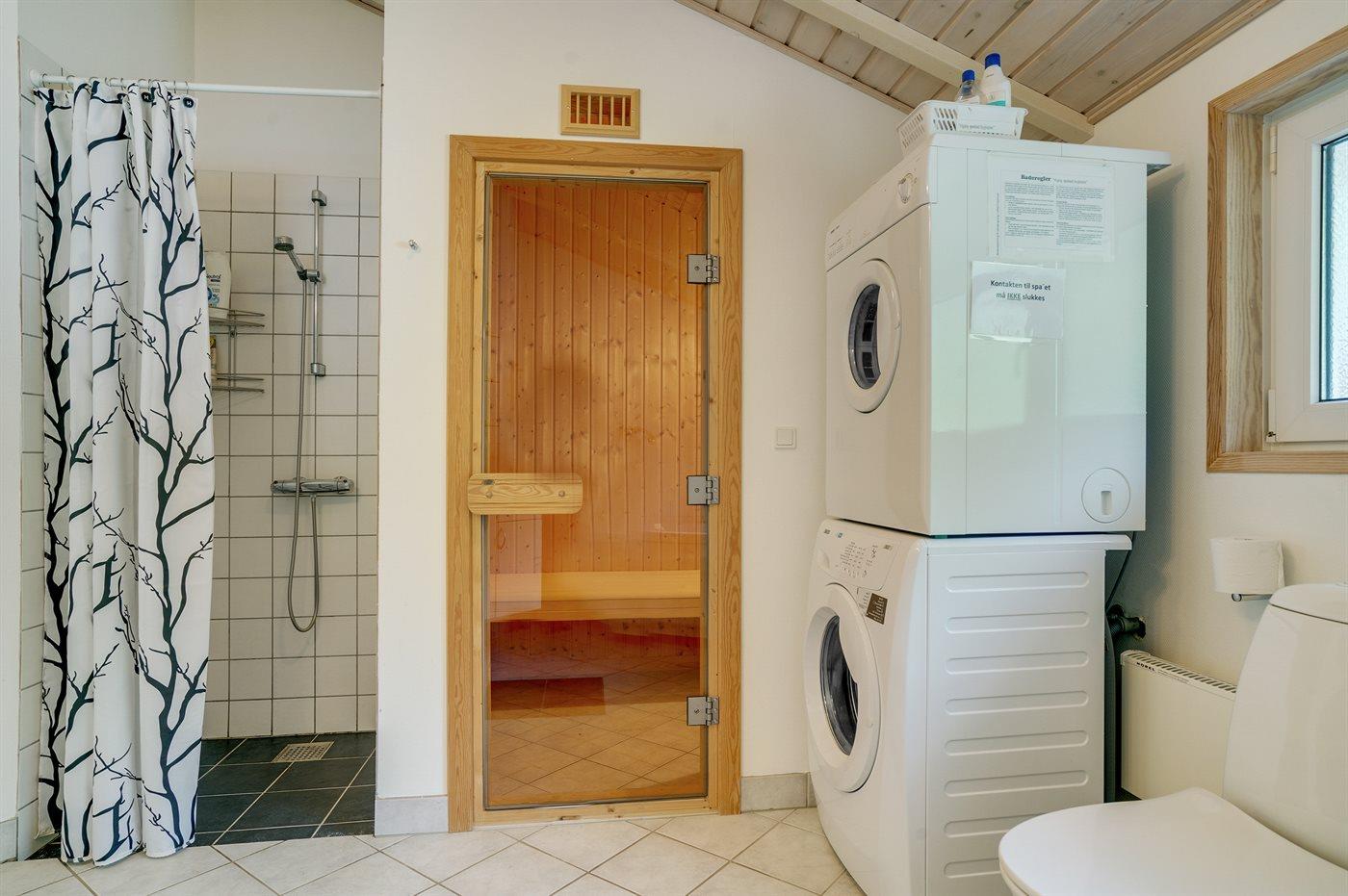 Der er 1 badeværelse med bruseniche og 1 toilet.. Der er gulvvarme på 1 badeværelse. I saunaen er der mulighed for afslapning.