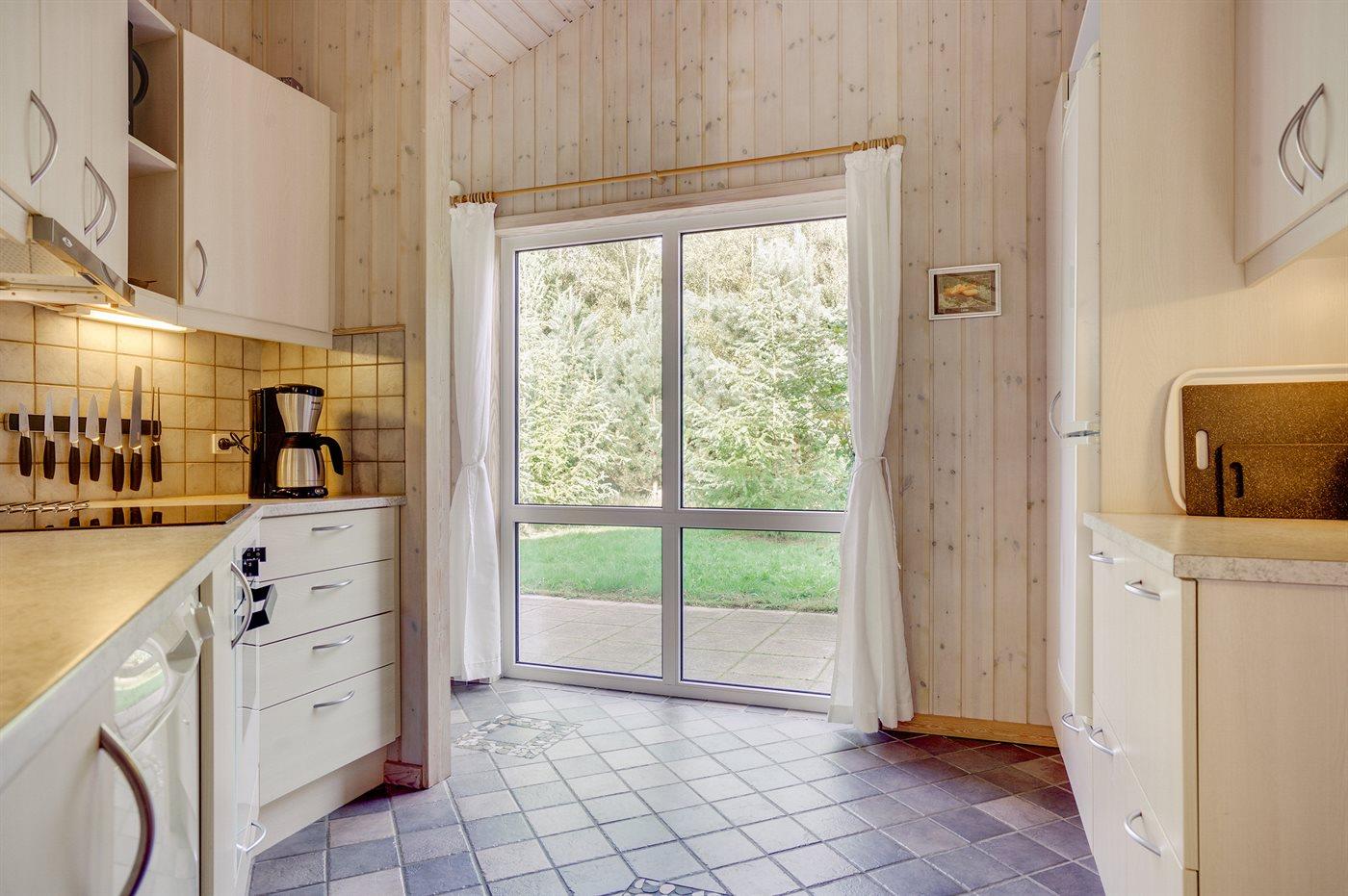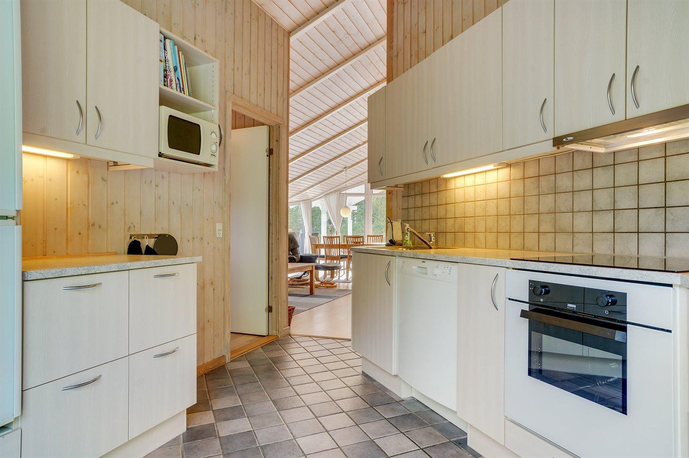 Køkkenet er udstyret med 1 køleskab. Der er 4 keramiske kogeplader, bageovn, varmluftovn, mikrobølgeovn samt opvaskemaskine Der er gulvvarme i køkkenet.