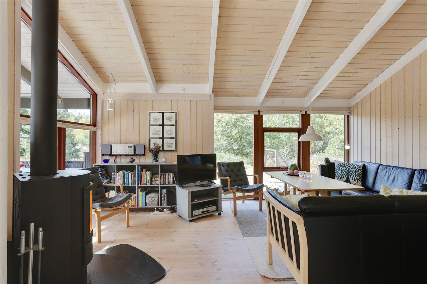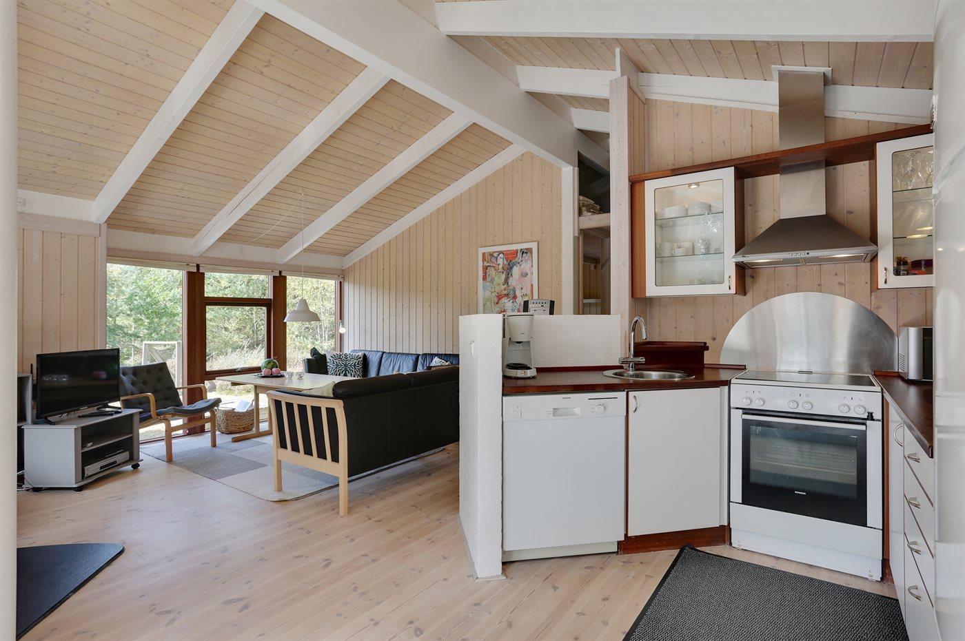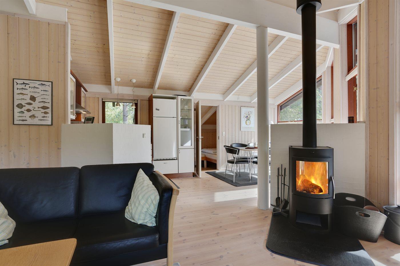 Smukt feriehus på Læsø med moderne køkken, brændeovn og stor naturgrund tæt på havet.