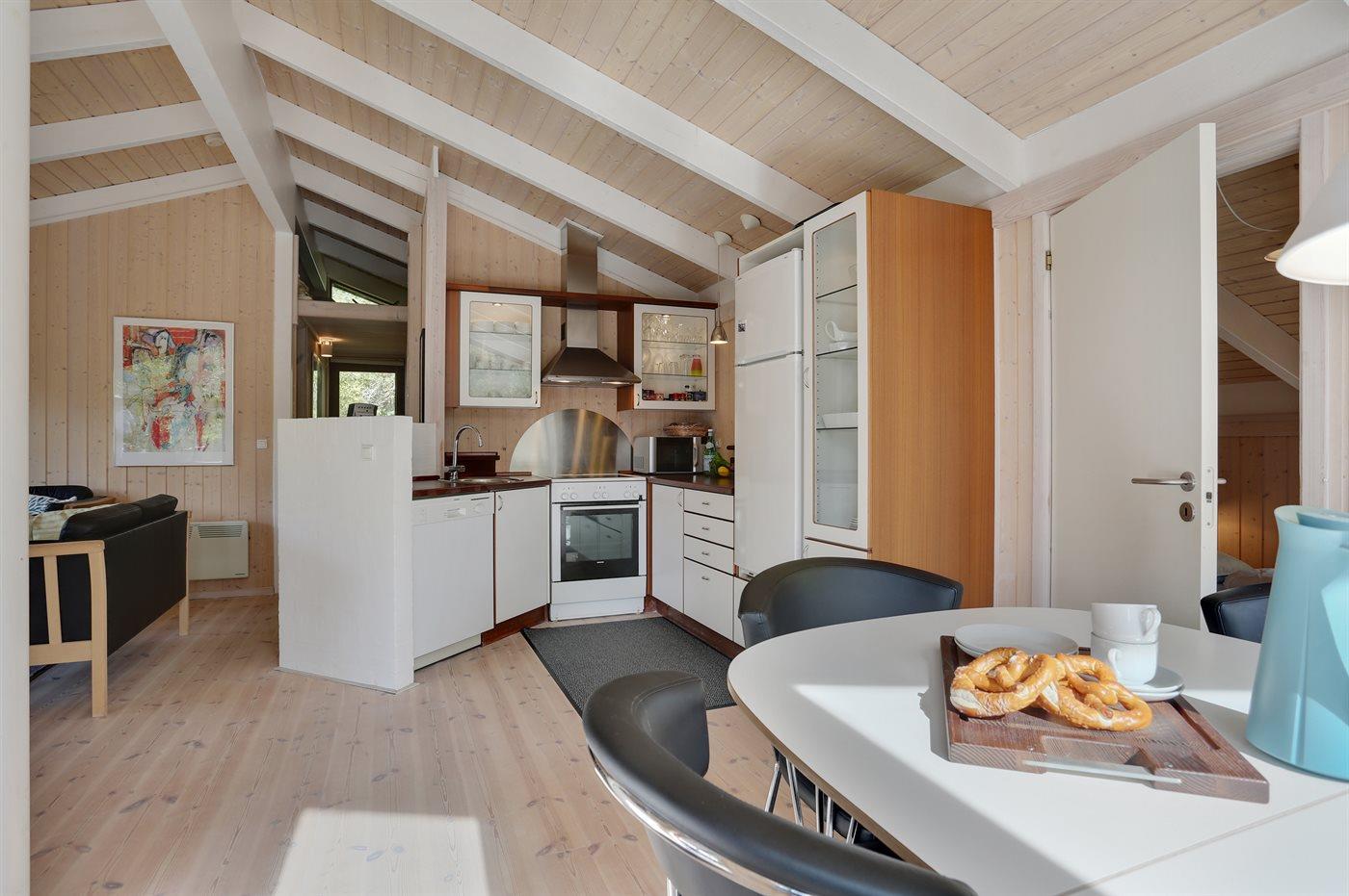 Køkkenet er udstyret med 1 køleskab. Der er 4 keramiske kogeplader, varmluftovn, mikrobølgeovn samt opvaskemaskine.