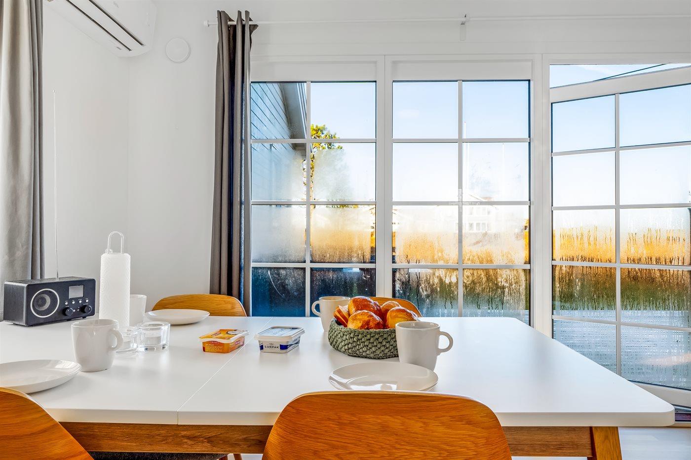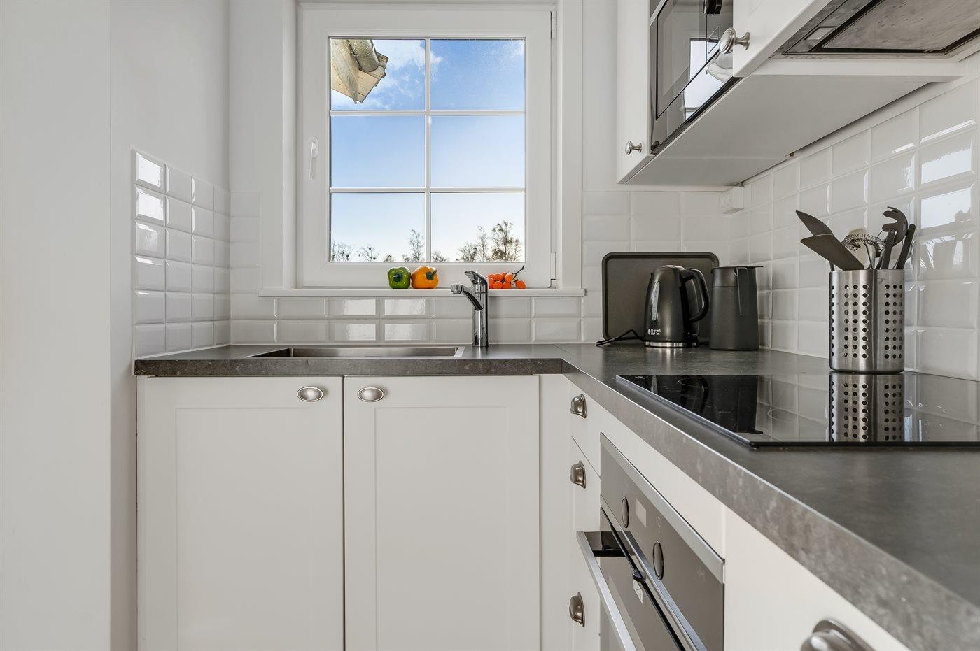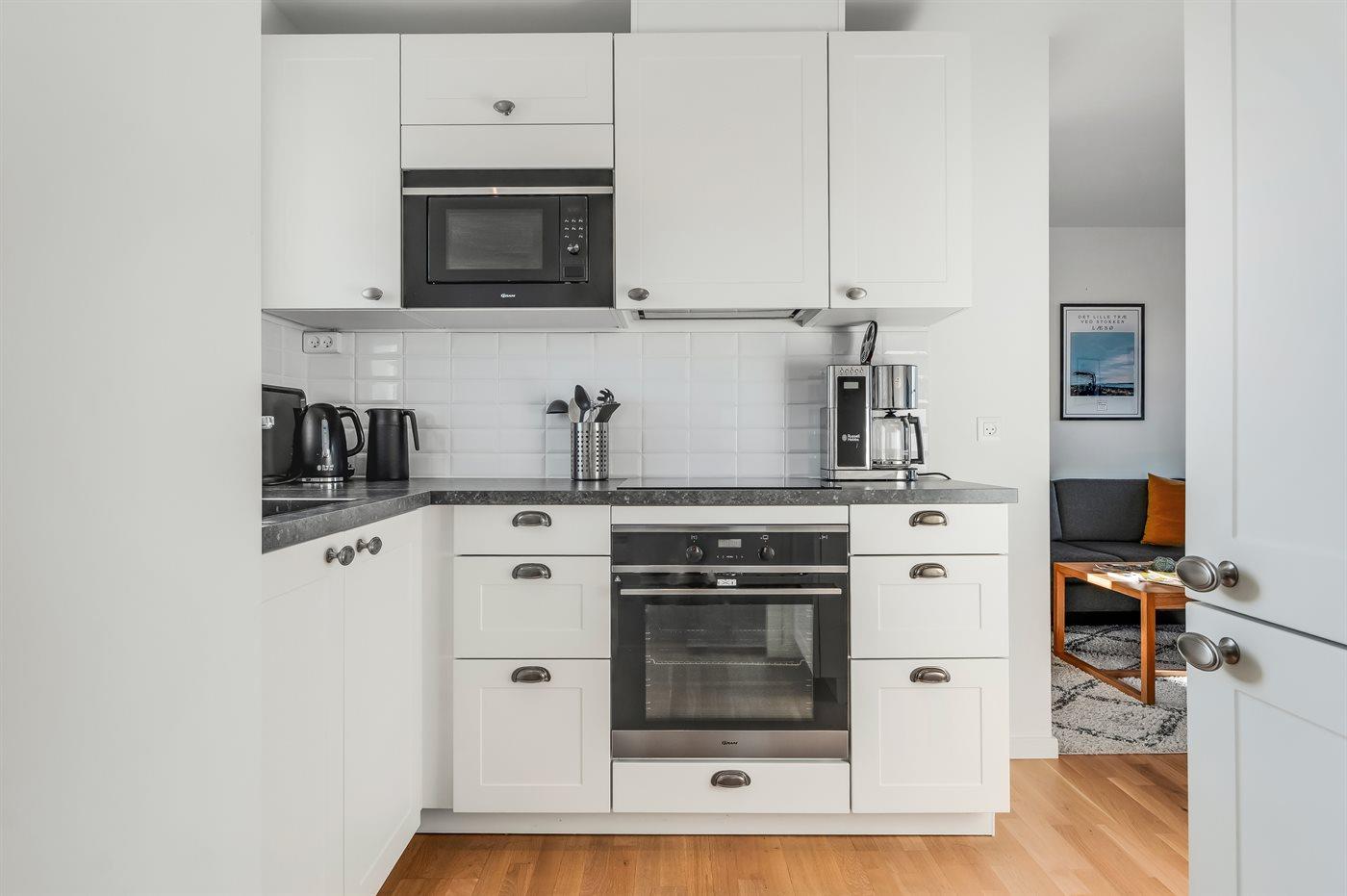 Køkkenet er udstyret med 1 køleskab. Der er 4 induktionskogeplader, varmluftovn, mikrobølgeovn.