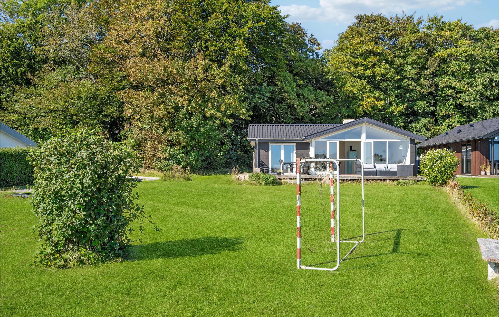 Moderne sommerhus ved Helnæs Bugt med panoramaudsigt, trampolin og fiskemuligheder lige ved vandet.