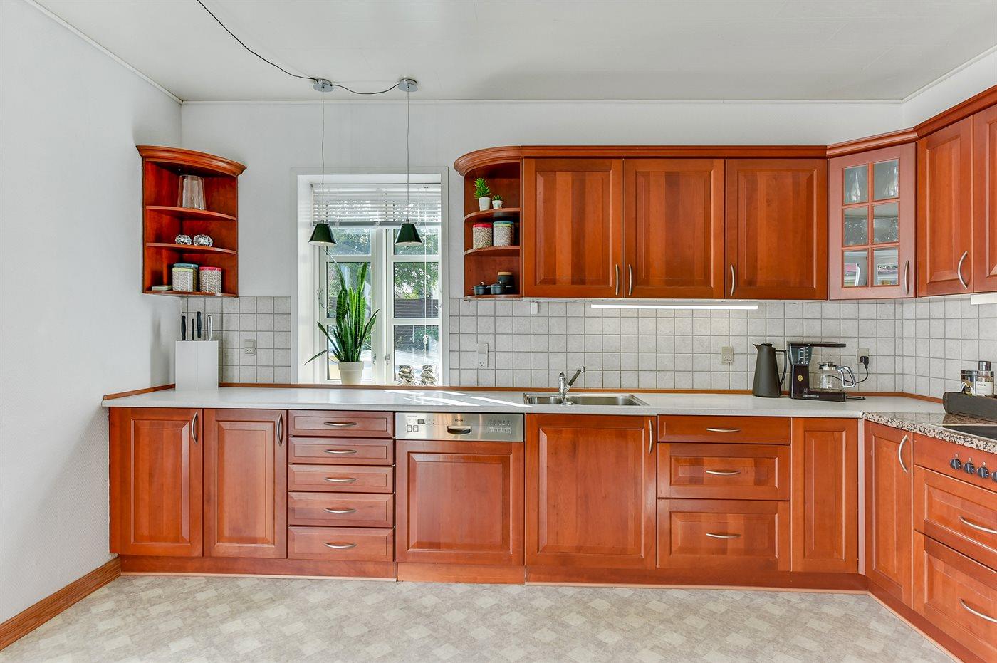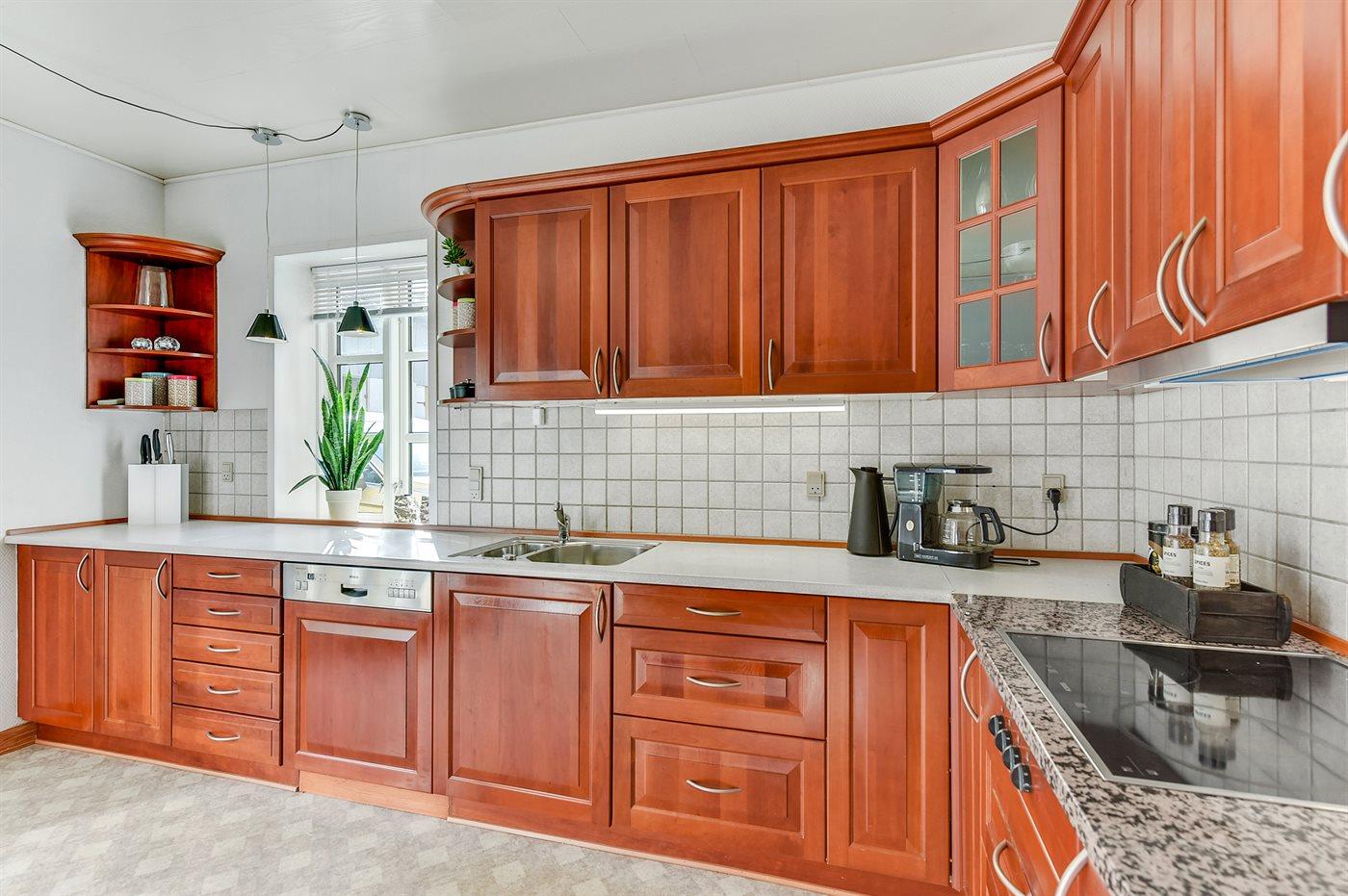 Køkkenet er udstyret med 1 køleskab. Der er 4 elkogeplader, bageovn, mikrobølgeovn samt opvaskemaskine.