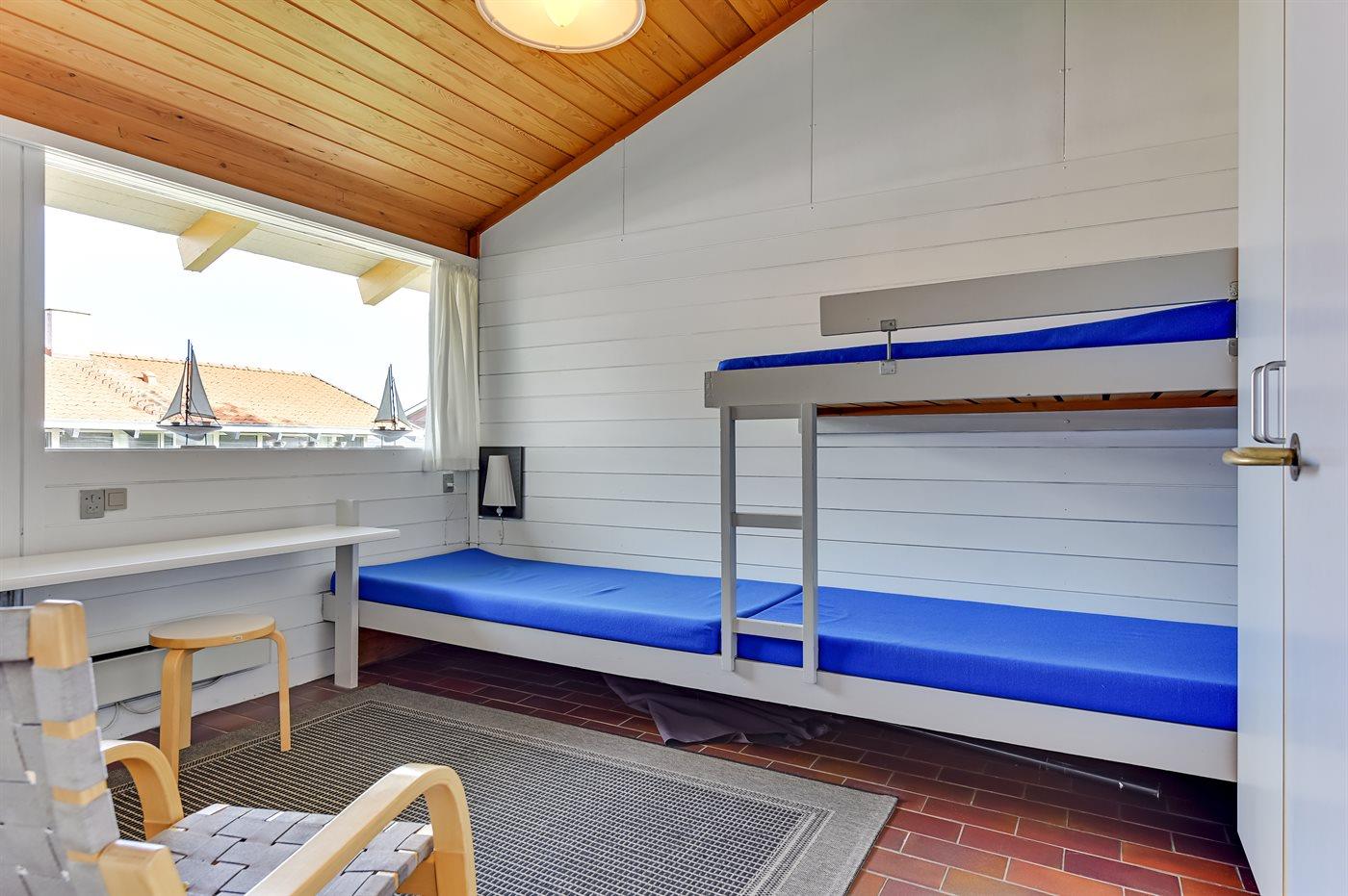 Der er i alt 2 soveværelser. Sovepladserne fordeler sig på: 2 sovepladser i dobbeltseng. 1 soveplads i enkeltseng. 2 sovepladser i køjeseng. Derudover er der 1 stk. barneseng.