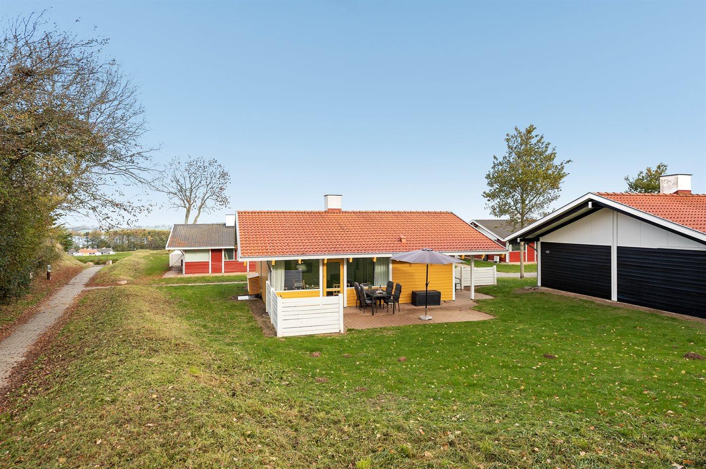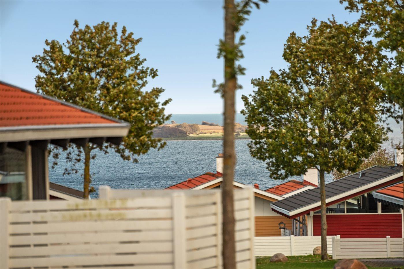 Velindrettet sommerhus i Løjt Feriecenter med havudsigt og adgang til pool, sauna og legeplads.