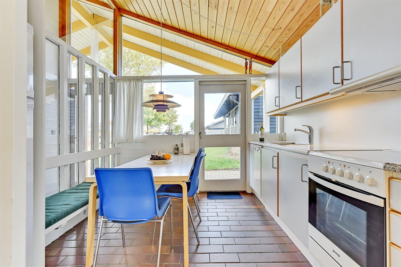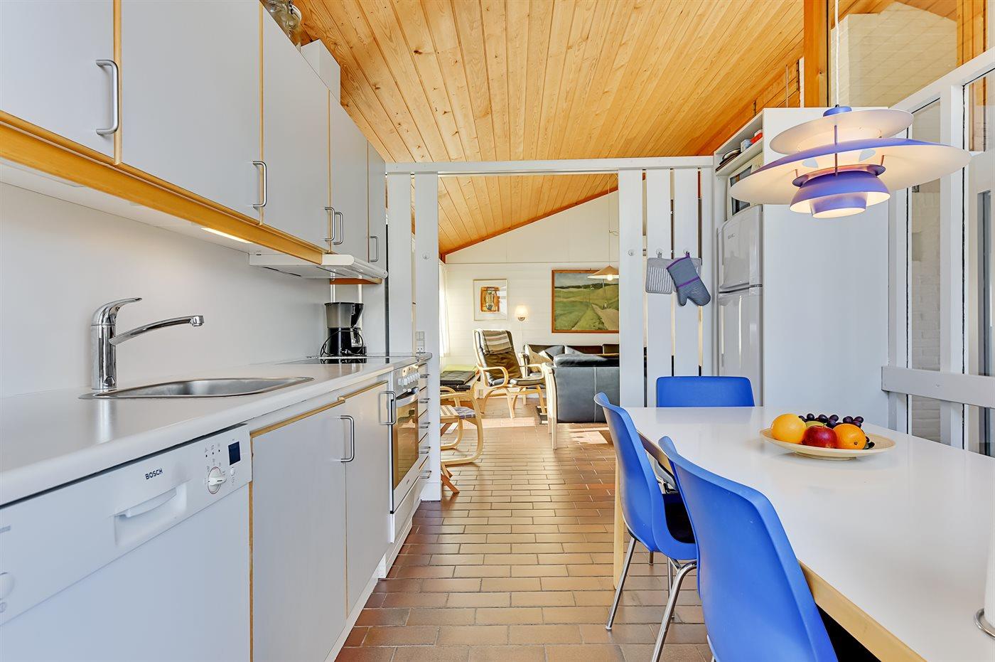 Køkkenet er udstyret med 1 køleskab. Der er 4 keramiske kogeplader, varmluftovn, mikrobølgeovn samt opvaskemaskine.