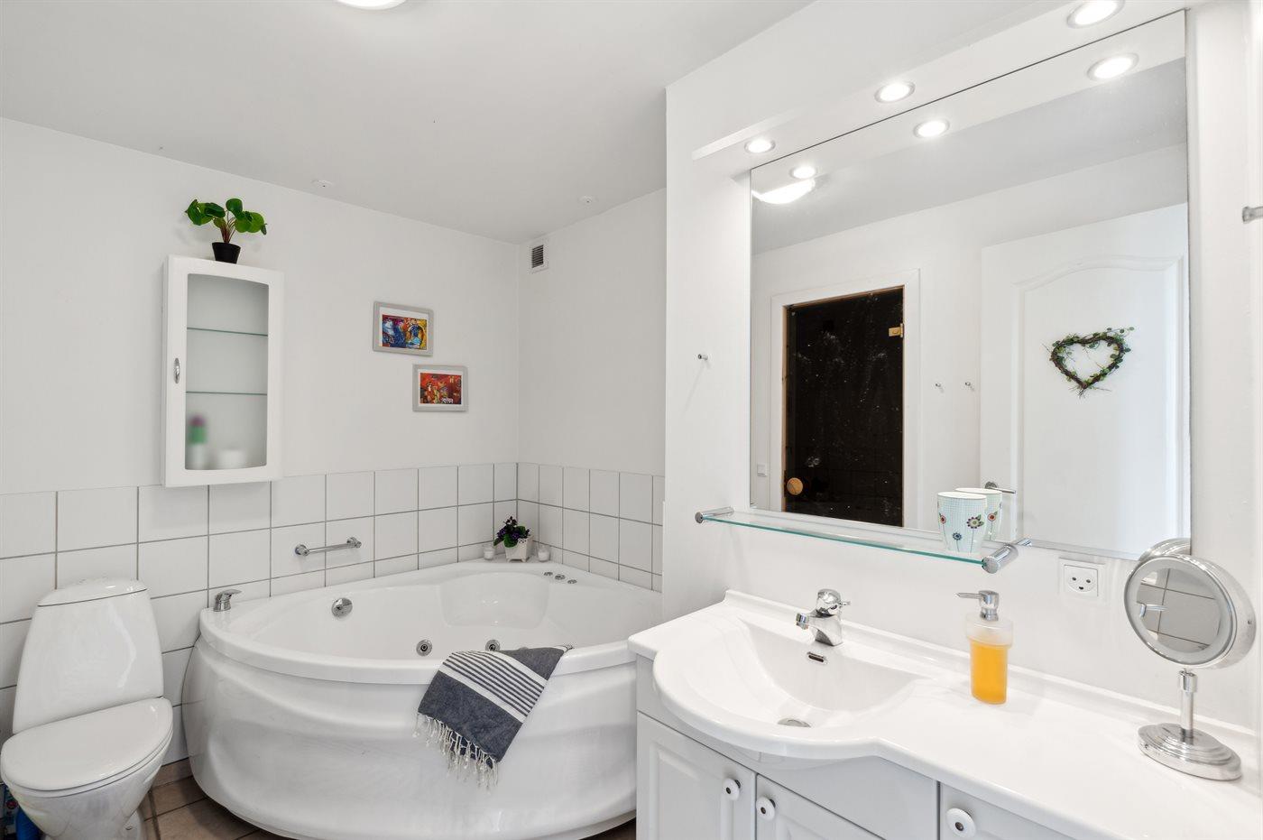 Der er 2 badeværelser med bruseniche og 2 toiletter. Der er gulvvarme på 2 badeværelser.