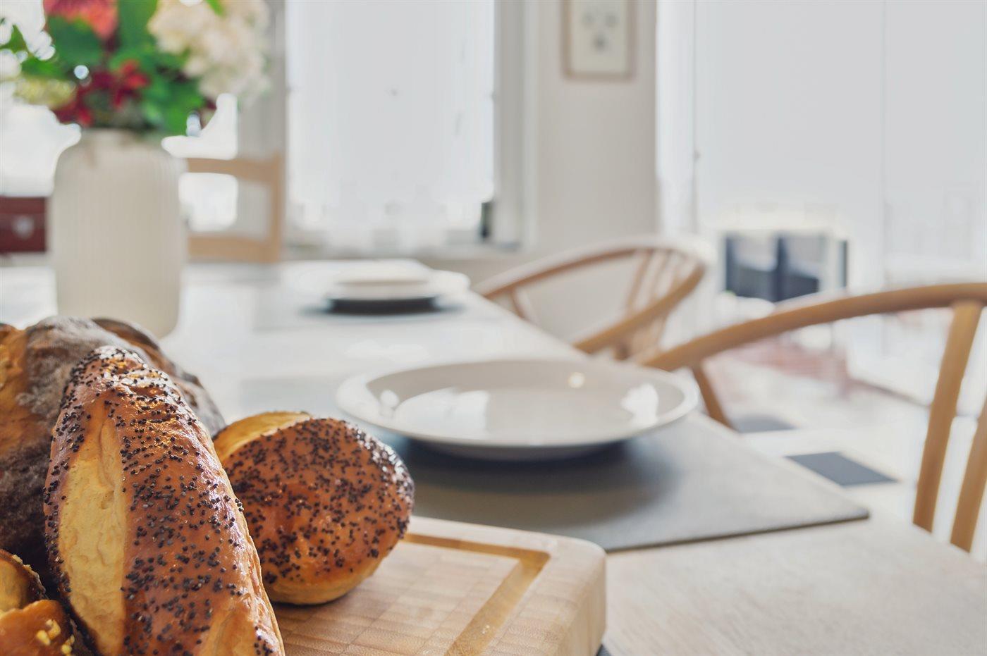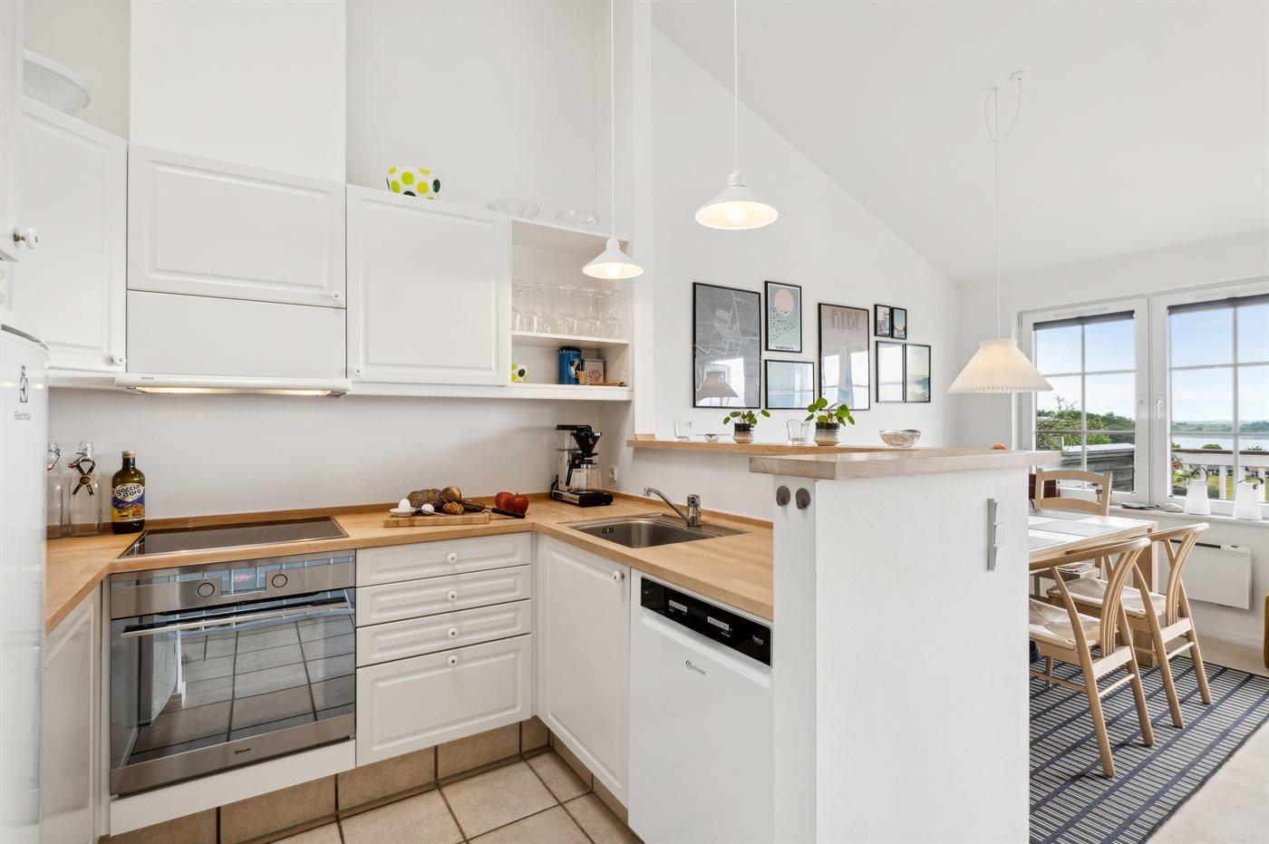 Køkkenet er udstyret med 1 køleskab. Der er 4 induktionskogeplader, varmluftovn samt opvaskemaskine.