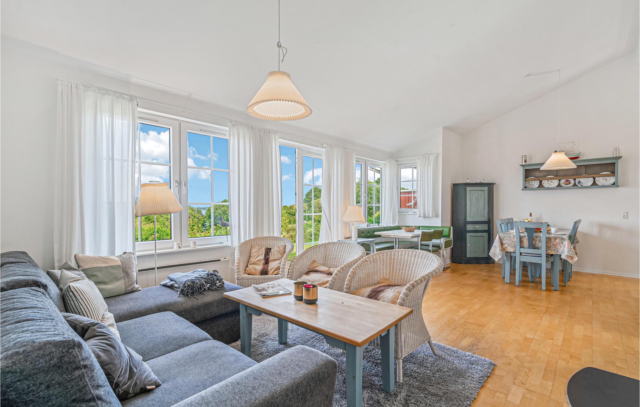 I smukke omgivelser ikke langt fra vandet byder dette rummelige feriehus jer velkommen. Indenfor finder I et komfortabelt interiør, der gør et lyst, smagfuldt indtryk og danner de ideelle rammer for dage med ro og velvære. Tilbring hyggelige stunder med familien i stuens forskellige siddekroge, hvad enten I sidder og nyder morgenmaden med udsigt over havet, slapper af med en god bog foran brændeovnen eller nyder gode snakke henover middagsbordet. Fra stuen træder I udenfor på terrassen, hvor I kan tilbringe solrige timer og lade blikket glide henover landskabet.