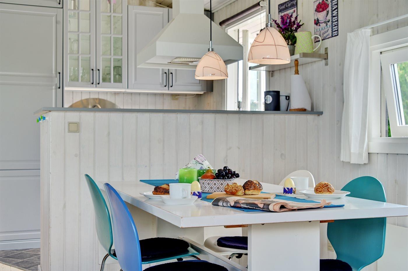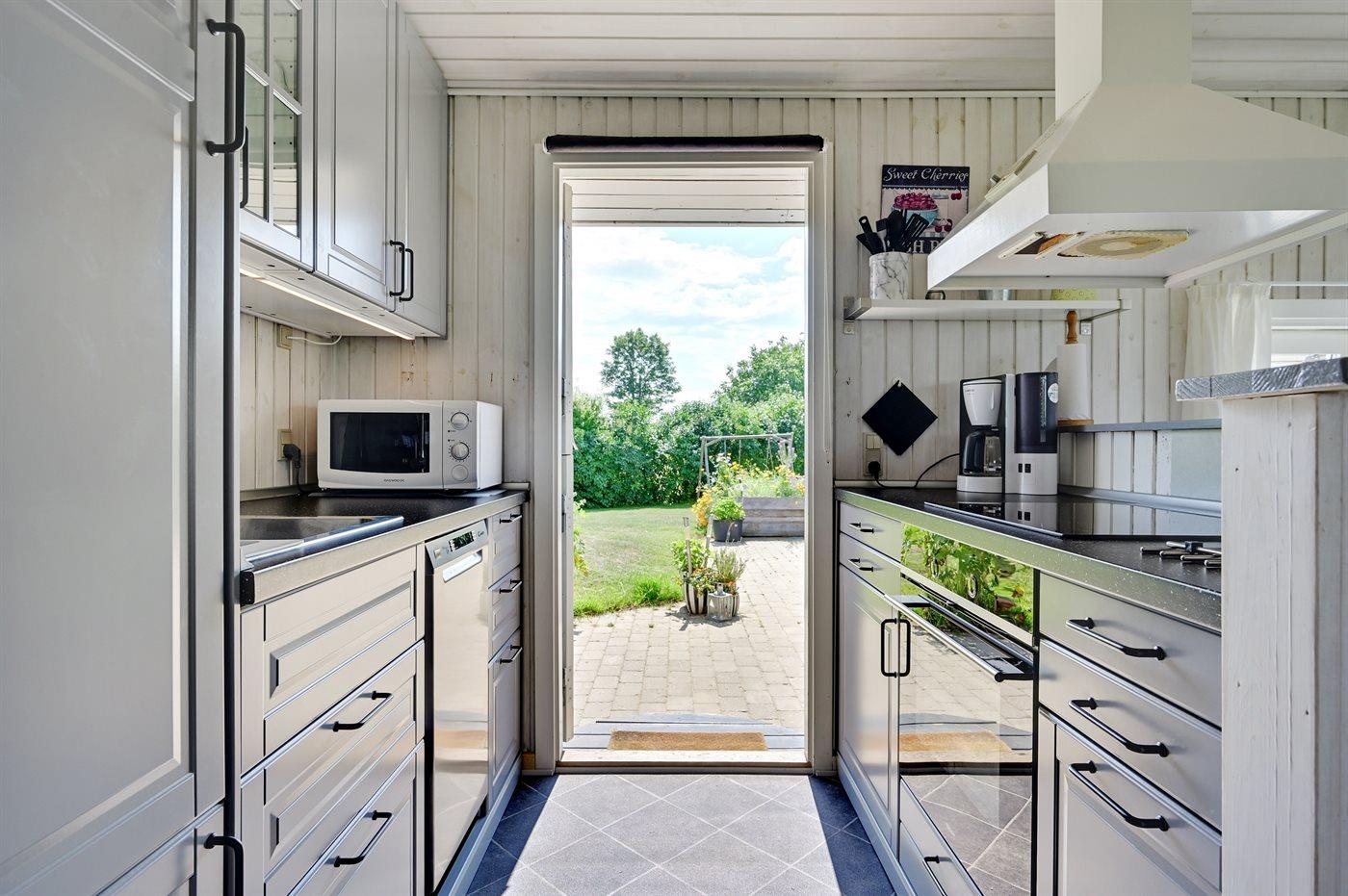 Køkkenet er udstyret med 1 køleskab. Der er 4 keramiske kogeplader, varmluftovn, mikrobølgeovn samt opvaskemaskine.
