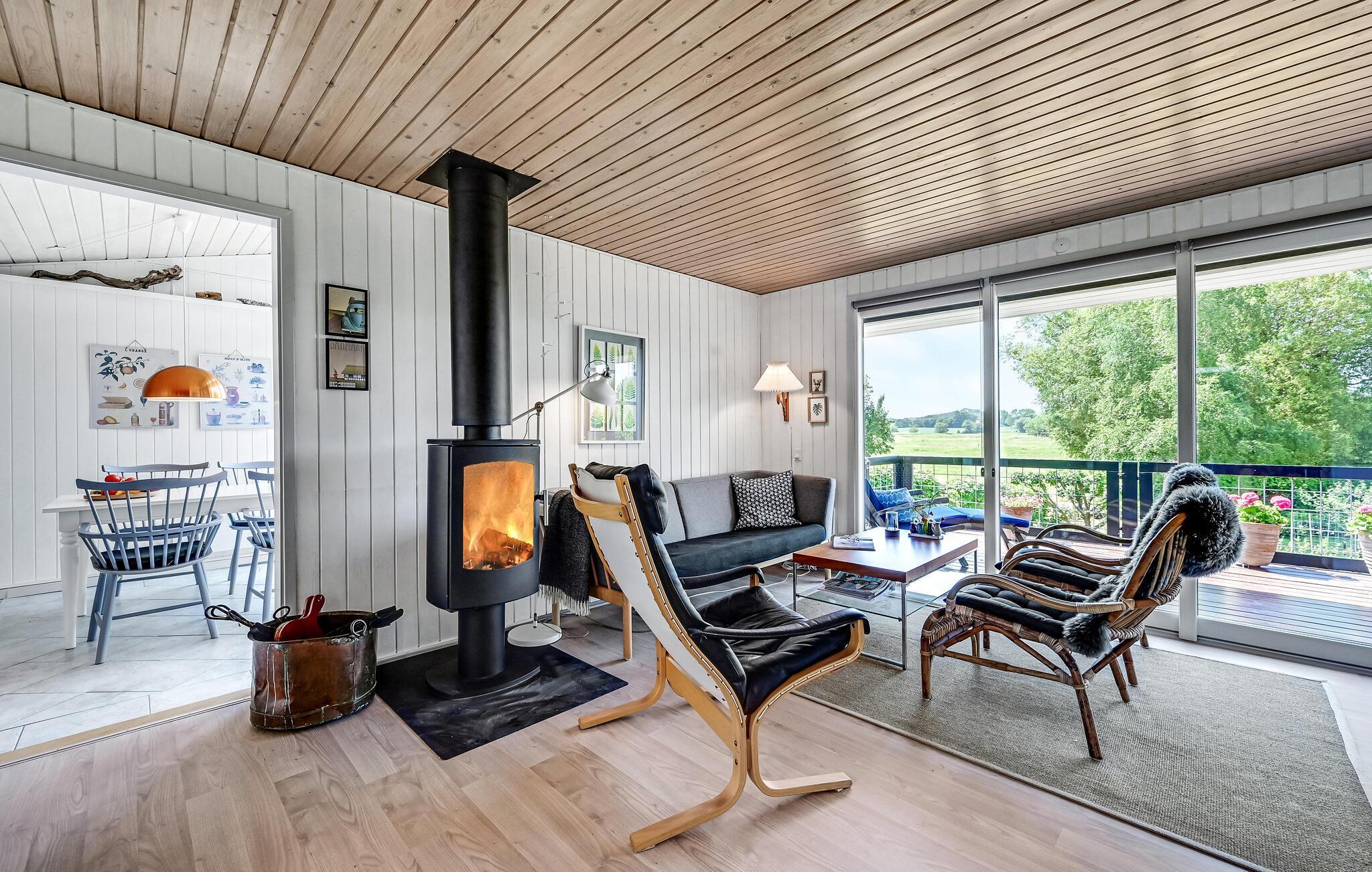 Charmerende træhus på Langeland med panoramaudsigt, nær børnevenlige strande og naturskønne omgivelser.