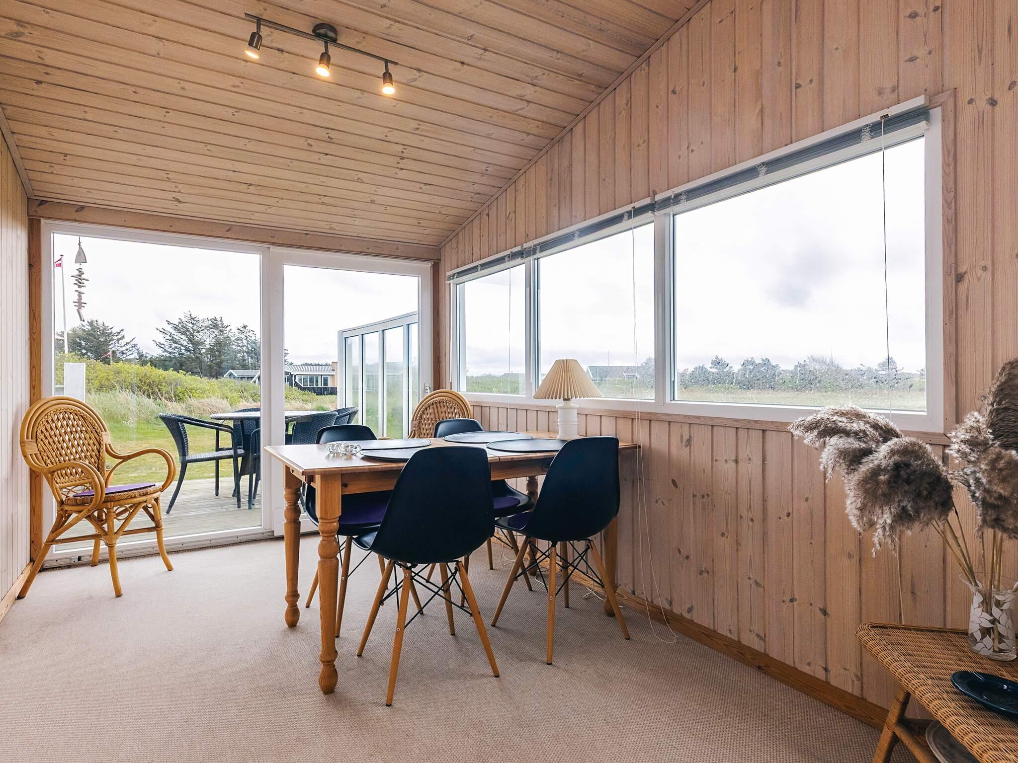 Indvendigt har feriehuset en åben stue i forbindelse med køkkenet med direkte udgang til terrassen. Badeværelset er udstyret med bruser og vaskemaskine for ekstra bekvemmelighed. Der er to soveværelser, samt en glaseret veranda, hvor du kan nyde sommeraftenerne i længere tid. En barneseng er også tilgængelig for familier med små børn.
