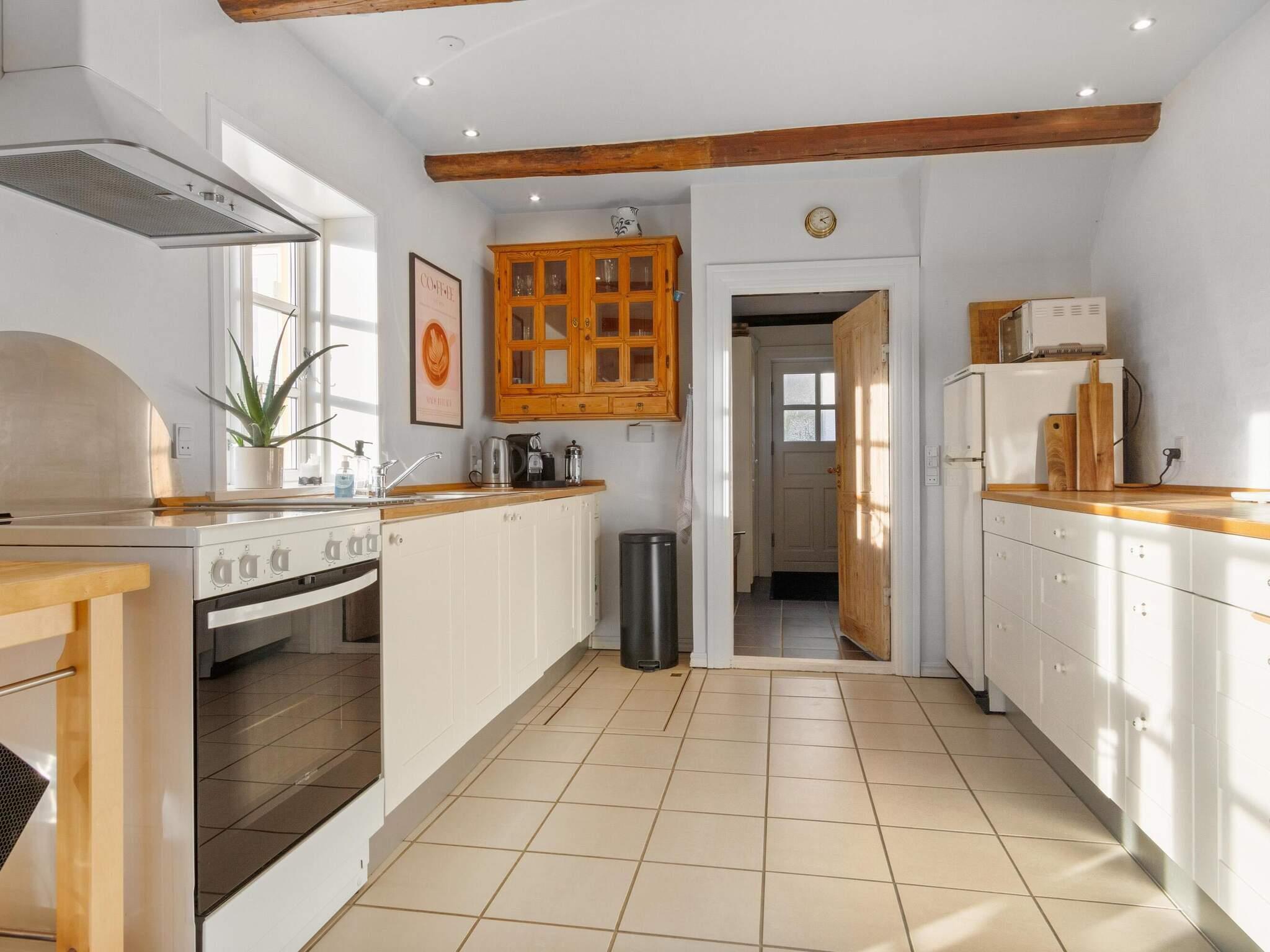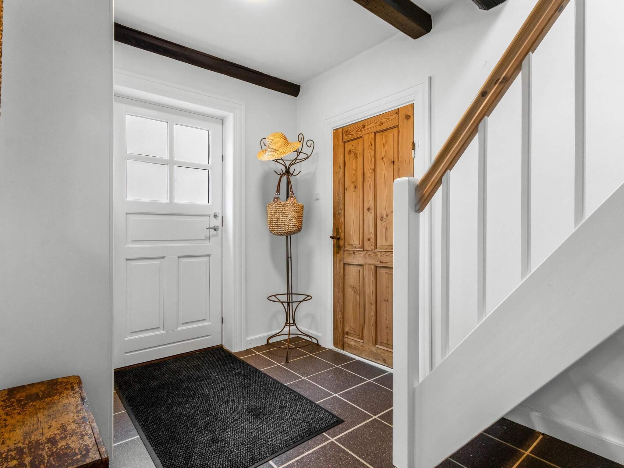 Indvendigt er den rummelige stue indrettet til både afslapning og aktivitet med et hyggeligt tv-hjørne, læsekrog, skrivebordsplads og en lys vinterhave, der åbner direkte ud til terrassen. Det landlige køkken og opholdsstue danner et naturligt samlingspunkt, der er ideelt til madlavning og samvær. I den ene ende af køkkenet ligger spisepladsen med plads til seks personer og udsigt til haven gennem franske døre. Stueetagen rummer også et badeværelse med toilet og et ekstra gæstetoilet.