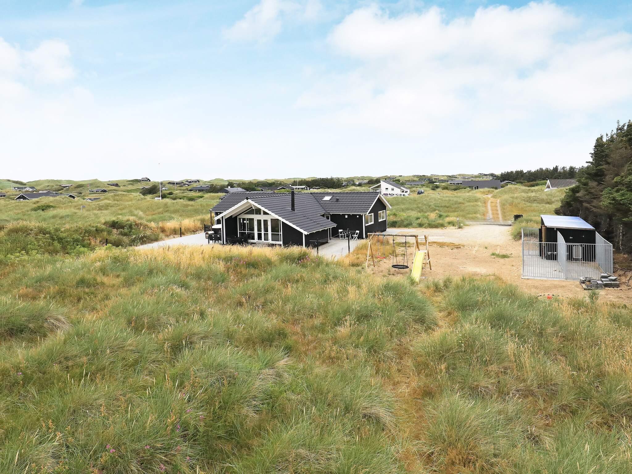 Luksuriøst sommerhus med aktivitetsrum samt spabad både inde og ude beliggende på en stor klitgrund i naturskønne omgivelser i det attraktive Løkken Syd. Fra hus og terrasse er der panoramaudsigt over klitområdet.