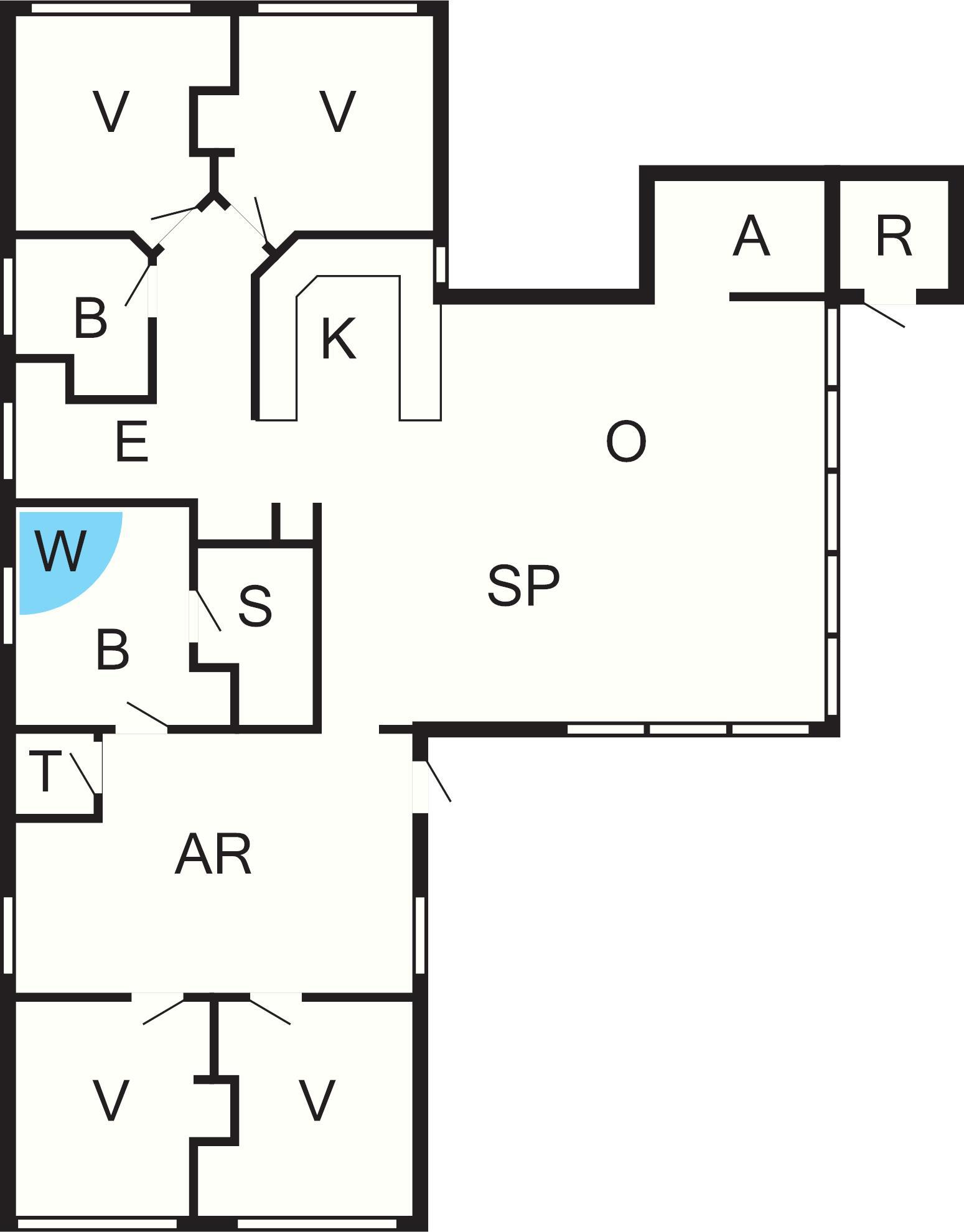Huset er opført i foråret 2018 og indeholder stue/køkken i åben forbindelse, fire soveværelser, alkove, aktivitetsrum og to badeværelser, hvoraf det ene har sauna og spabad. Der er også udendørs spabad samt en udendørs bruser.