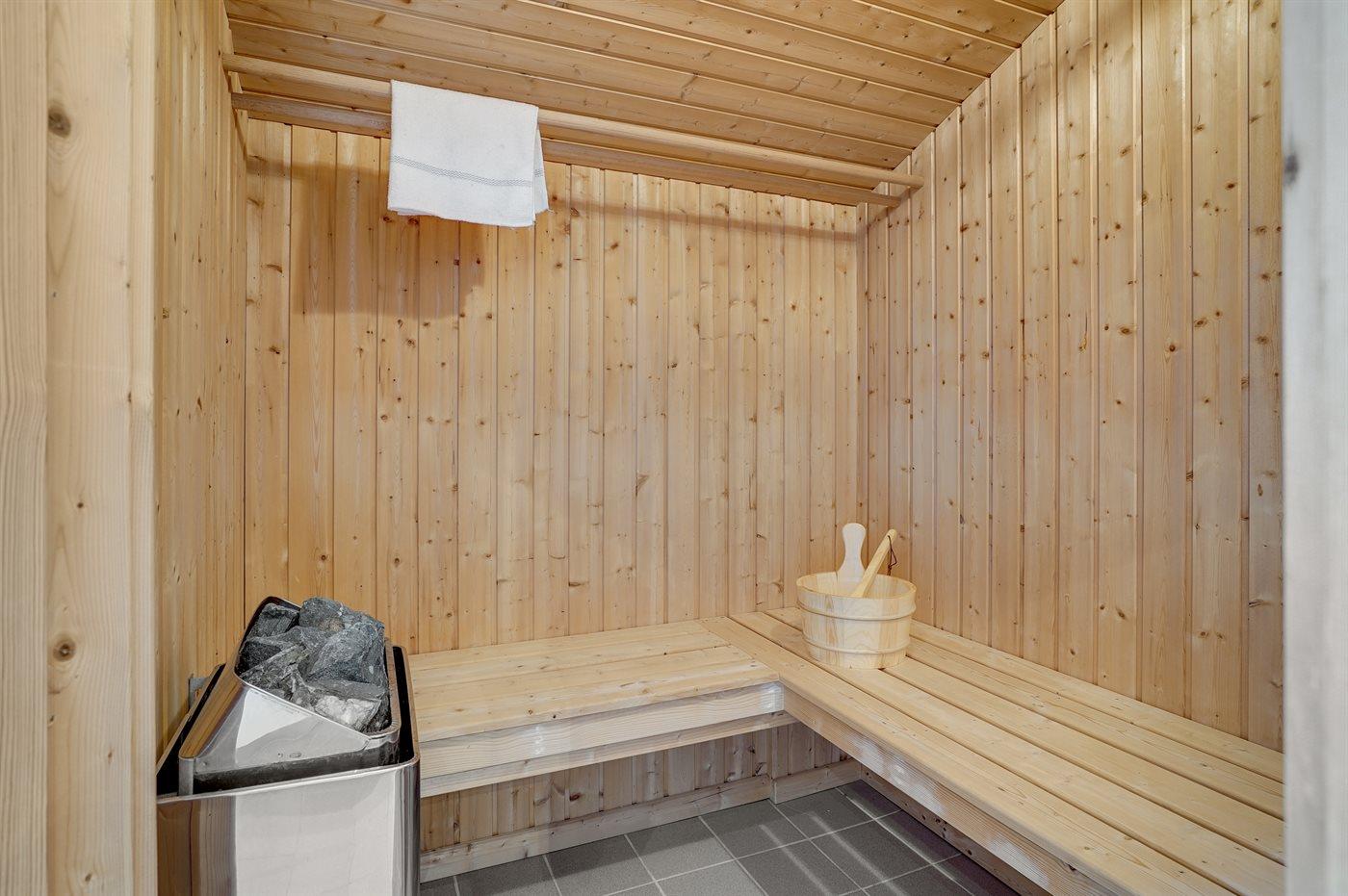Der er 2 badeværelser med bruseniche og 2 toiletter. Der er gulvvarme på 2 badeværelser. I saunaen er der mulighed for afslapning.