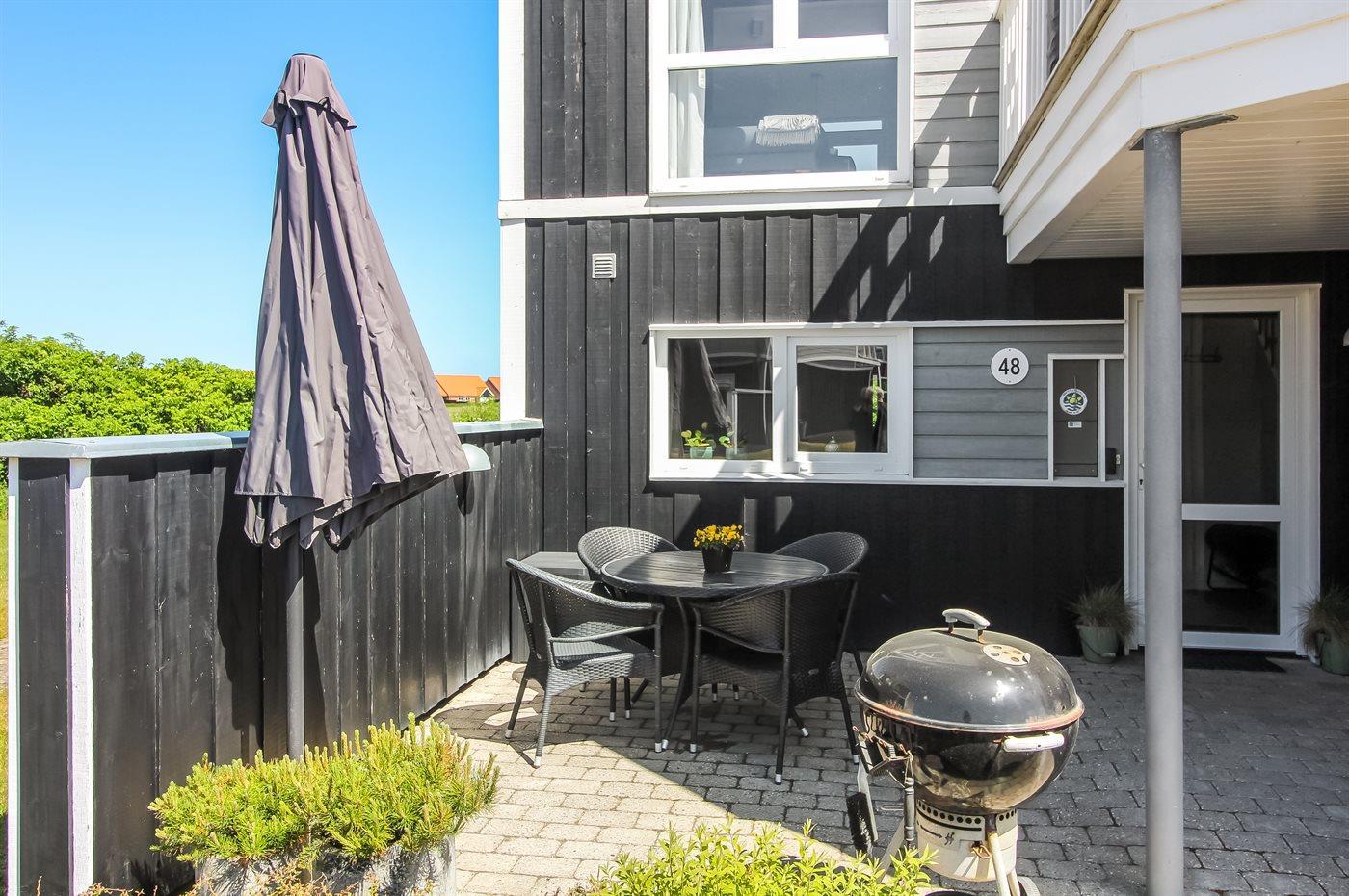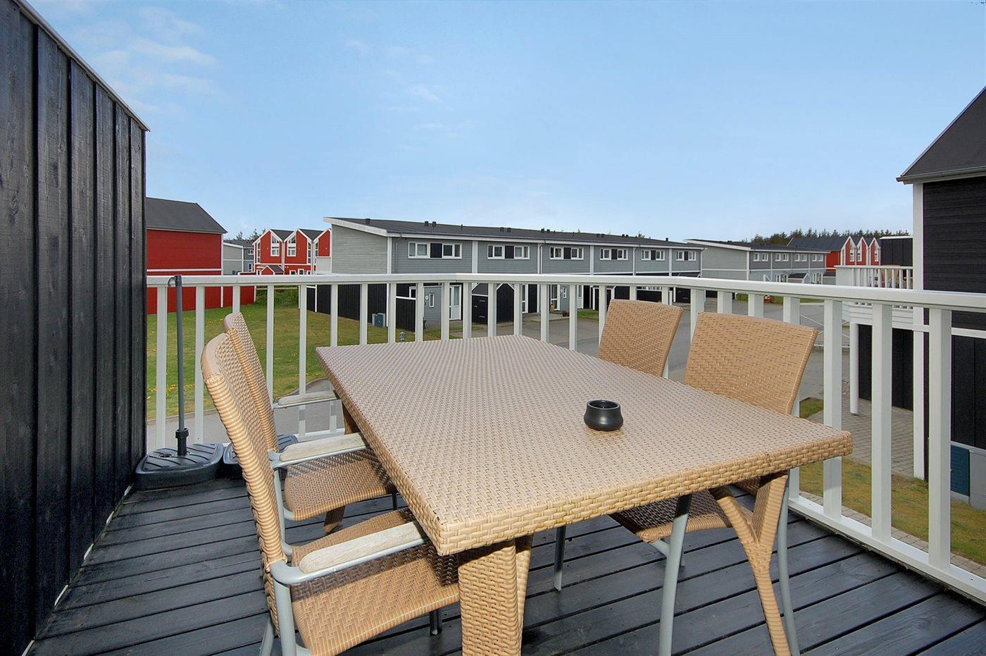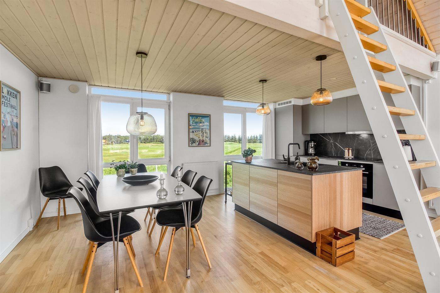 Lejligheden er indrettet lyst og indbydende med store vinduer i begge gavle som giver et fantastisk lysindfald. Desuden adgang til hems med 2 sovepladser og god udsigt over golfbanerne. Hemsen fungerer også som hyggeafdeling for børn med bl.a. sækkestole. I opholdsstuen er der udgang til terrasse med havemøbler, hvorfra der også er udsigt til den ene legeplads.
