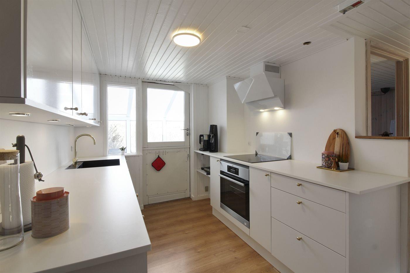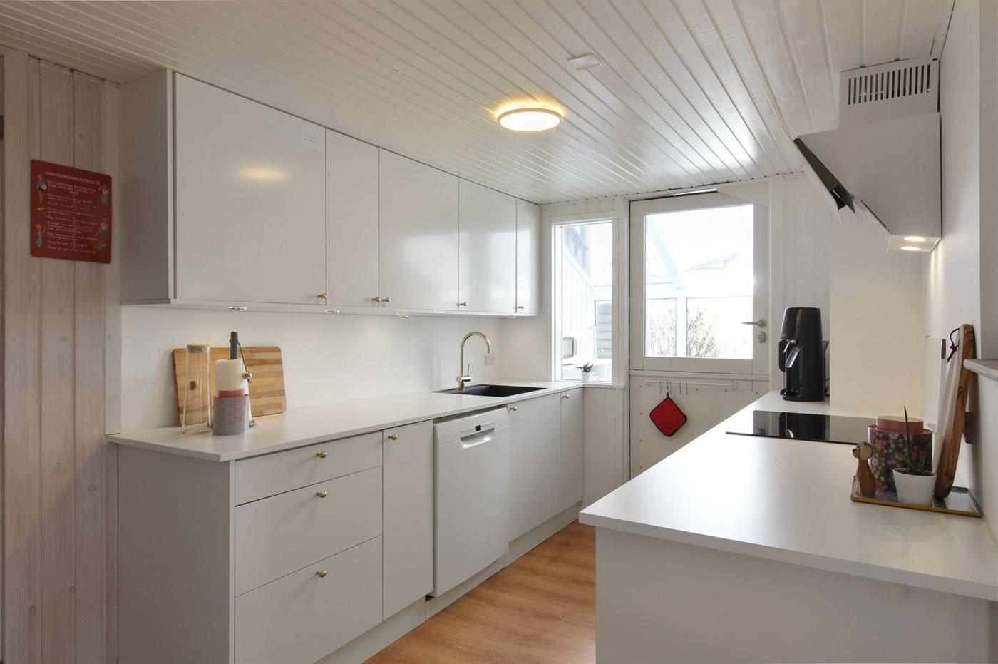 Køkkenet er udstyret med 1 køleskab. Der er 4 keramiske kogeplader, varmluftovn, mikrobølgeovn samt opvaskemaskine.