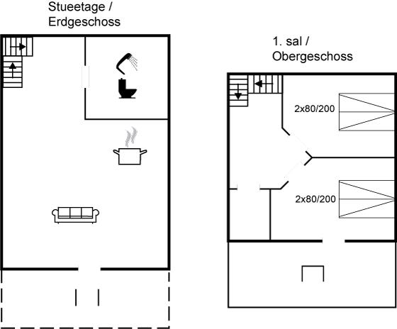 Der er i alt 2 soveværelser. Sovepladserne fordeler sig på: 4 sovepladser i dobbeltsenge. 2 sovepladser på madrasser. 2 af disse sovepladser befinder sig på husets hems. Derudover er der 1 stk. barneseng.