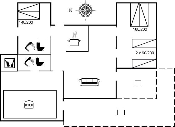 Der er i alt 3 soveværelser. Sovepladserne fordeler sig på: 4 sovepladser i dobbeltsenge. 2 sovepladser i enkeltsenge. 2 sovepladser på madrasser. 2 af disse sovepladser befinder sig på husets hems. Derudover er der 1 stk. barneseng.