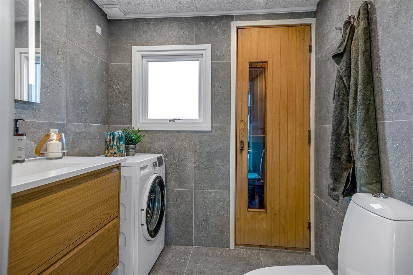 Der er 1 badeværelse med bruseniche og 1 toilet.. Der er gulvvarme på 1 badeværelse. I saunaen er der mulighed for afslapning.