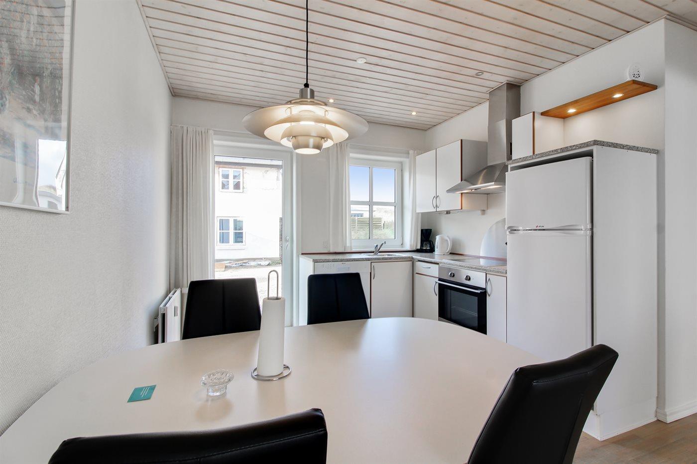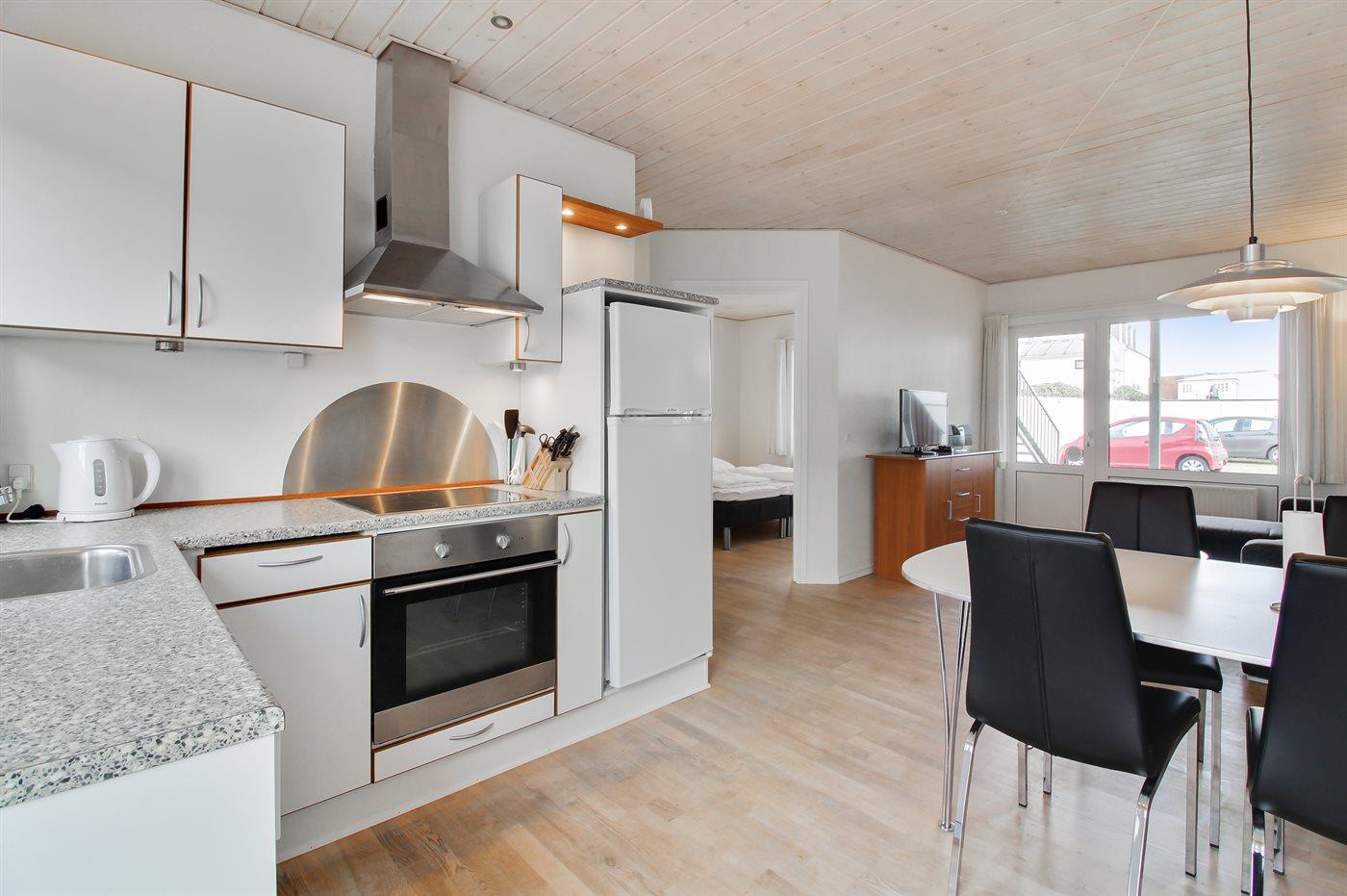 Køkkenet er udstyret med 1 køleskab. Der er 4 keramiske kogeplader, varmluftovn samt opvaskemaskine.
