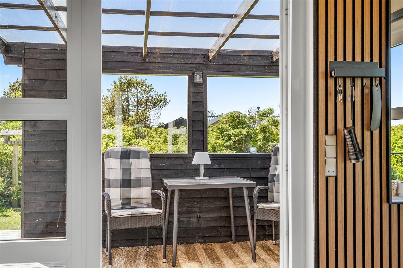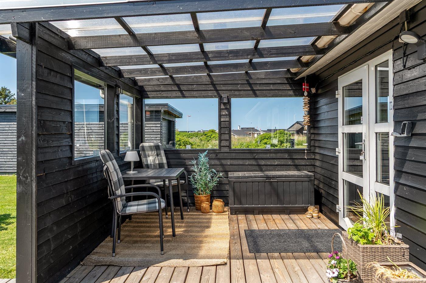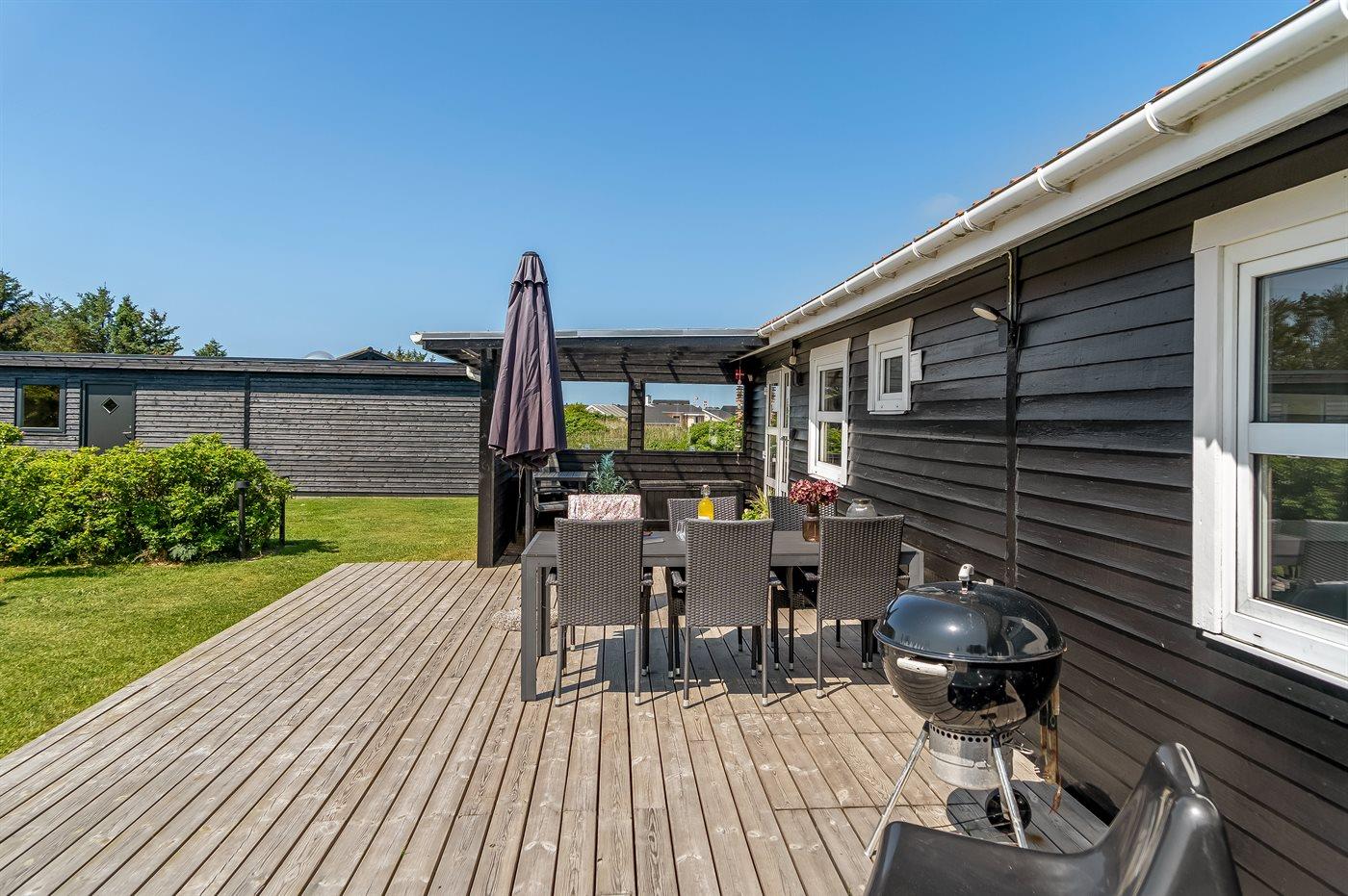 På en kølig sommeraften kan man krybe i ly i den overdækkede terrasse eller så er det ind foran brændeovnen. Og når solen rigtig skinner og det dejlige sommervejr skal nydes, så kan man hygge sig med lidt grill-hygge og et køligt glas i på terrassen.