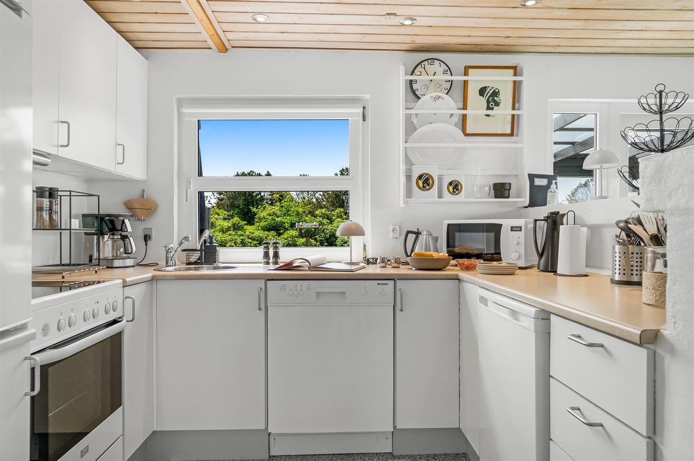 Køkkenet er udstyret med 1 køleskab. Der er 4 keramiske kogeplader, varmluftovn, mikrobølgeovn samt opvaskemaskine.