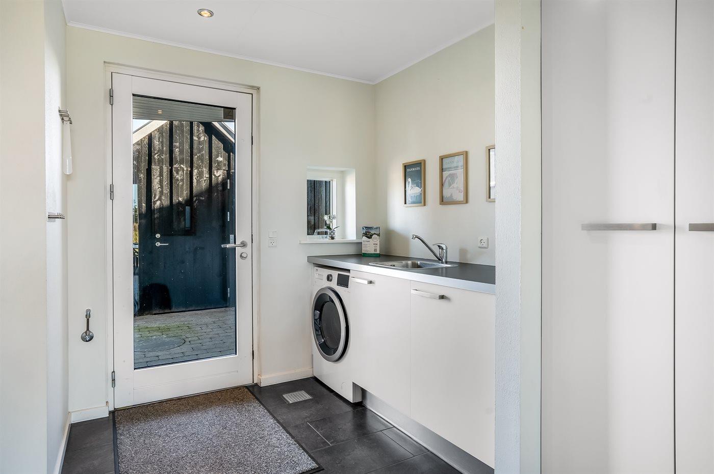 Køkkenet er udstyret med 1 køleskab. Der er 4 keramiske kogeplader, varmluftovn, mikrobølgeovn samt opvaskemaskine Der er gulvvarme i køkkenet.