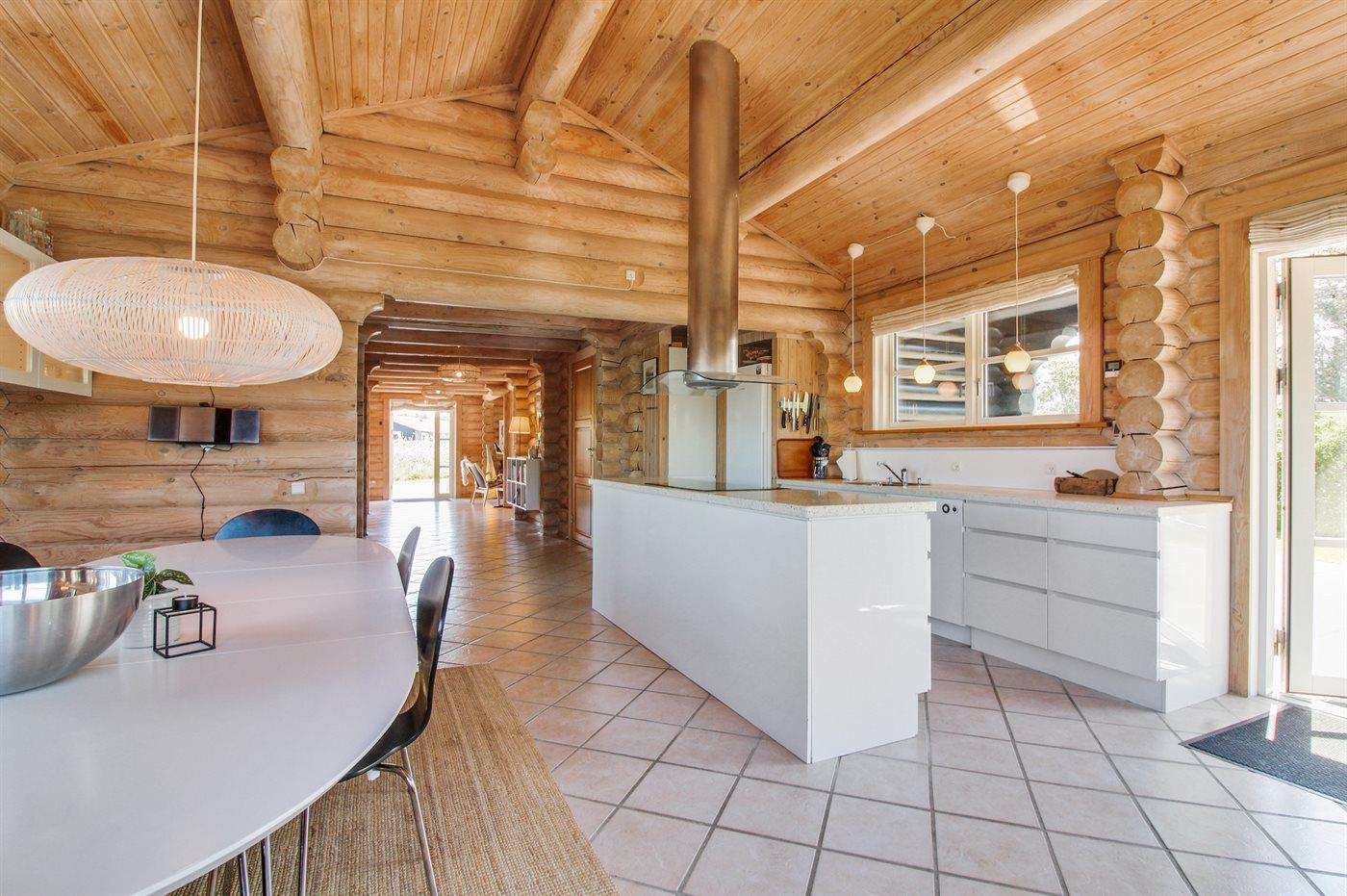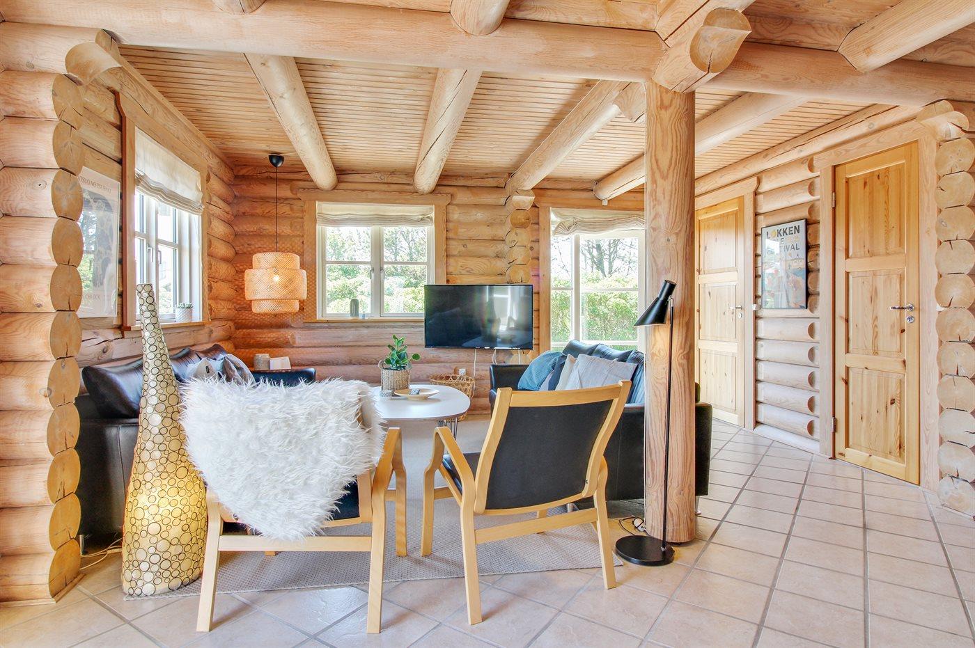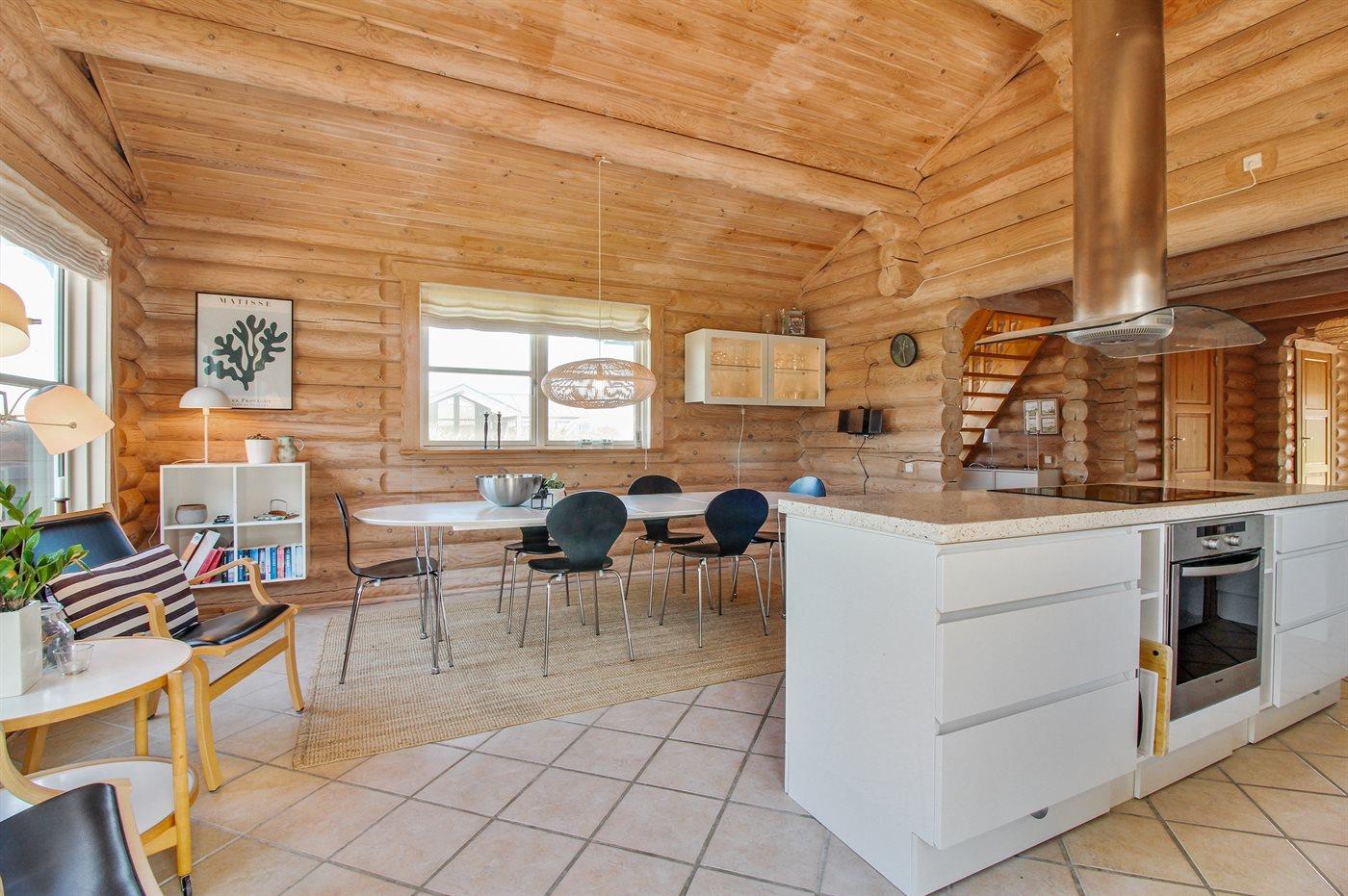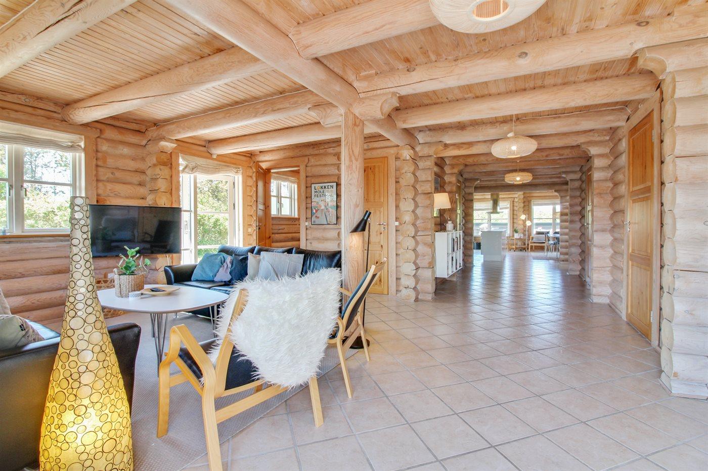Sommerhus beliggende for enden af blind vej i roligt sommerhusområde. Huset er et flot bjælkehus med 60 m2 hems, hvor børnene kan få meget tid til at gå med at lege.