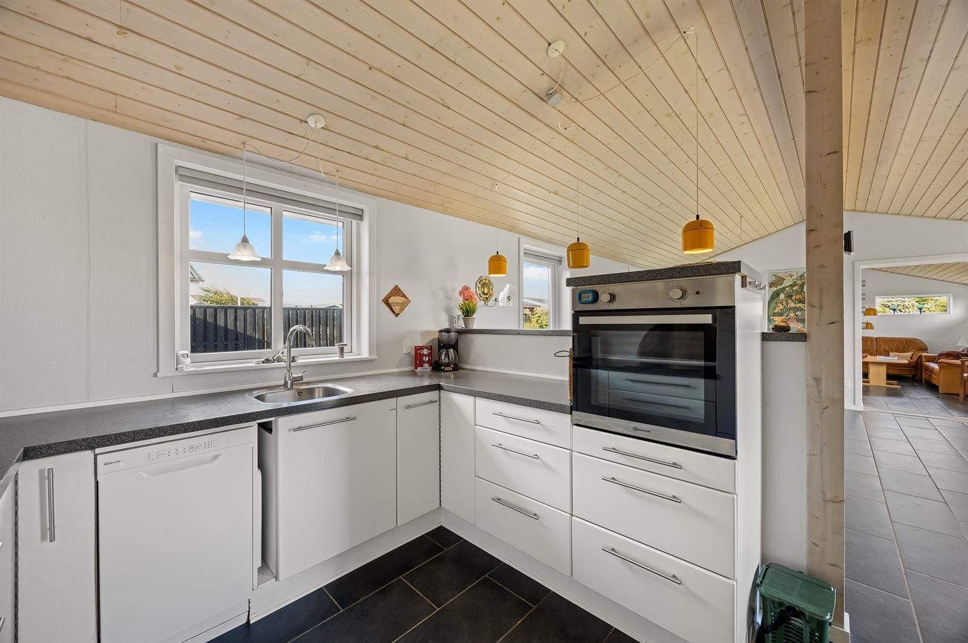 Køkkenet er udstyret med 1 køleskab. Der er 4 keramiske kogeplader, varmluftovn, mikrobølgeovn samt opvaskemaskine Der er gulvvarme i køkkenet.