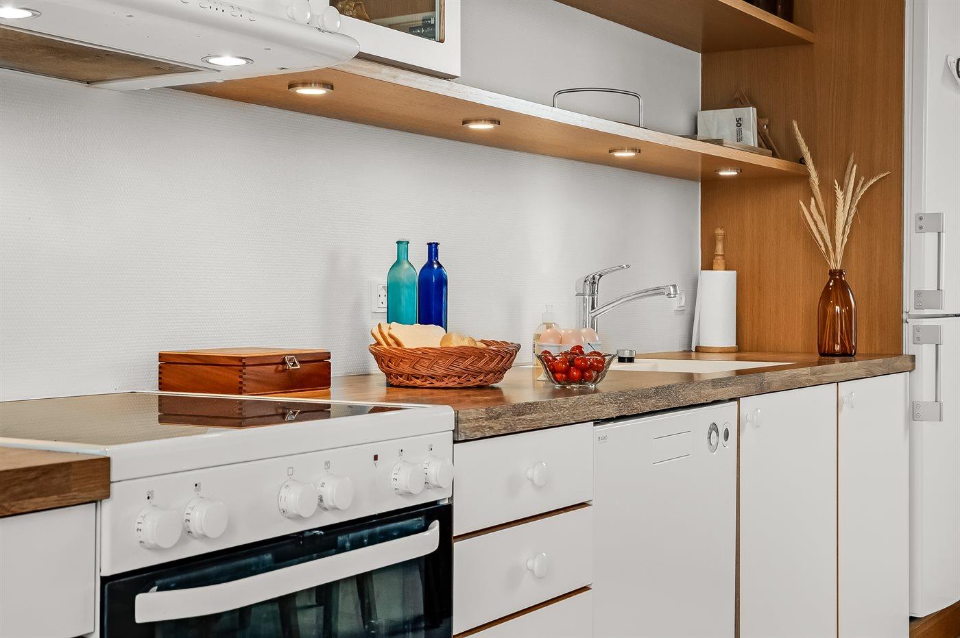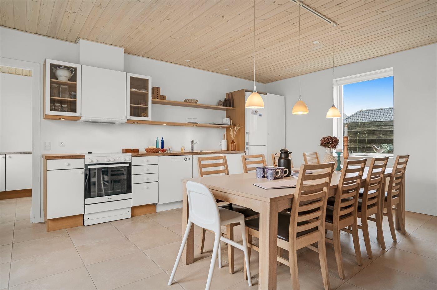 Køkkenet er udstyret med 1 køleskab. Der er 4 keramiske kogeplader, varmluftovn, mikrobølgeovn samt opvaskemaskine Der er gulvvarme i køkkenet.