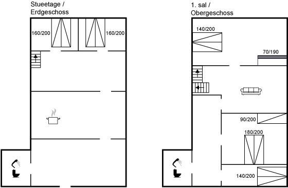 Der er i alt 5 soveværelser. Sovepladserne fordeler sig på: 10 sovepladser i dobbeltsenge. 1 soveplads i enkeltseng. 2 sovepladser i køjeseng.