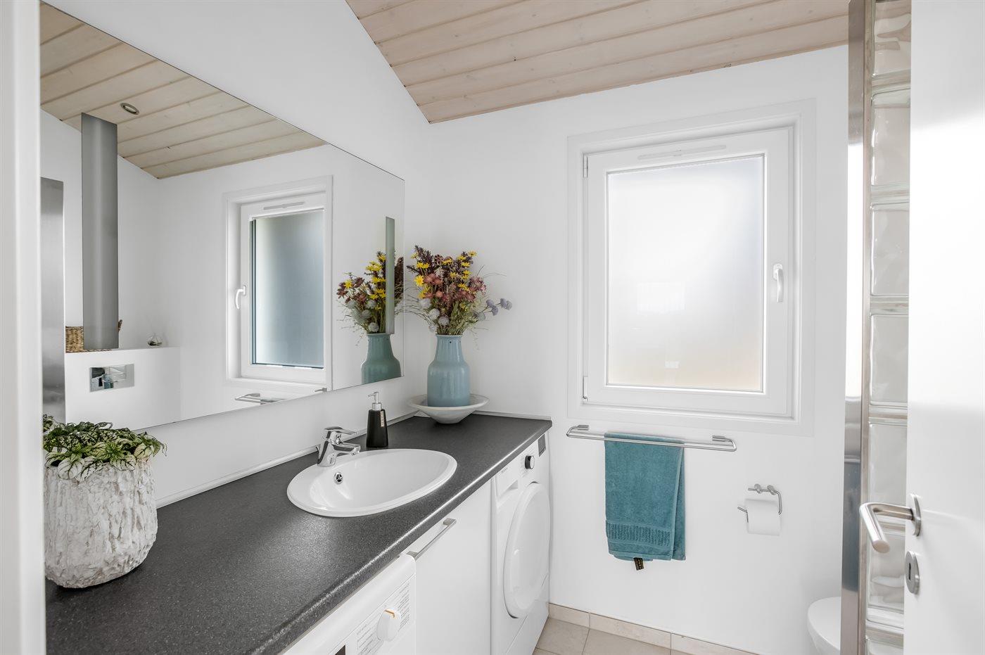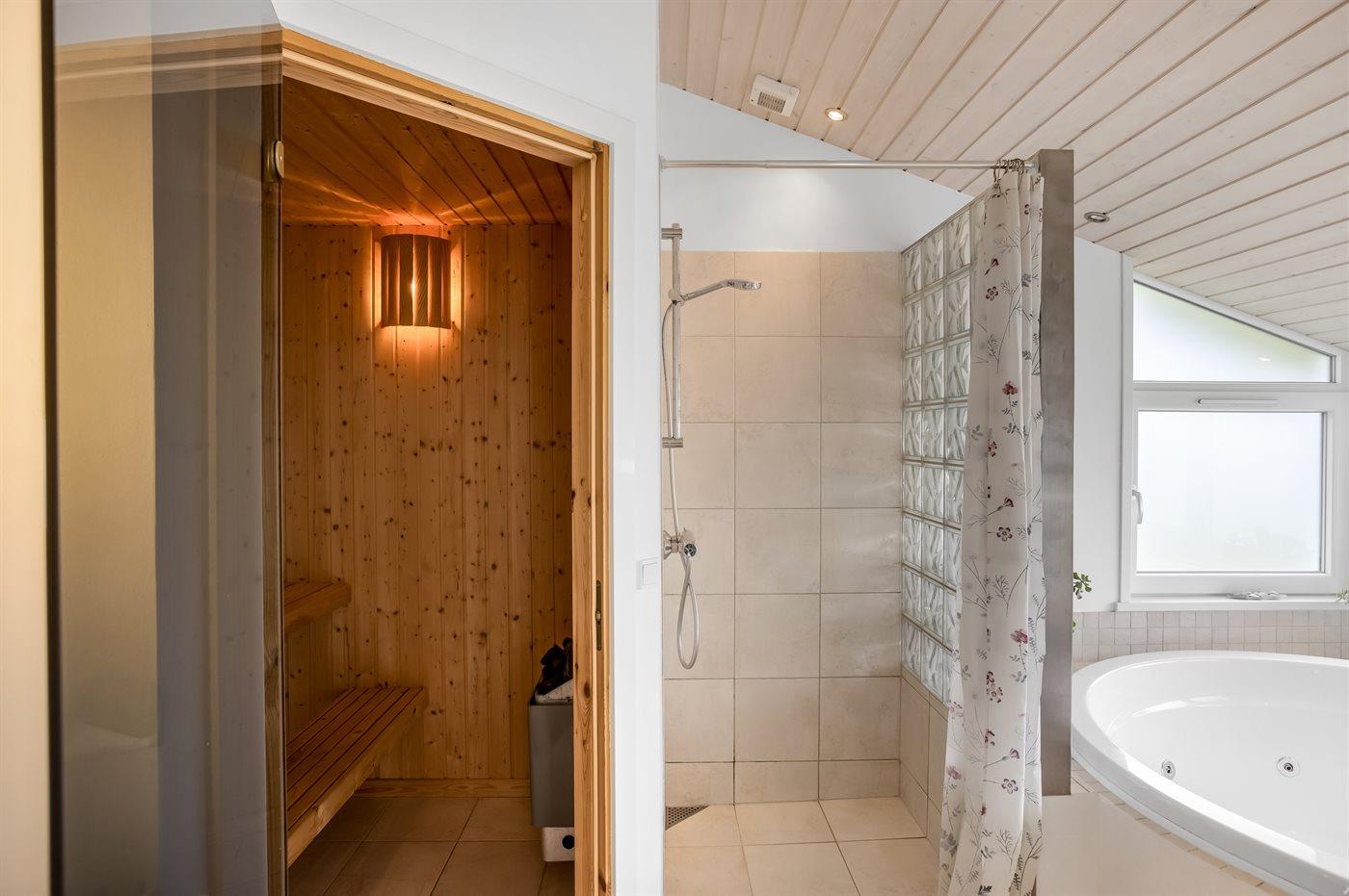 Der er 2 badeværelser med bruseniche og 2 toiletter. Der er gulvvarme på 2 badeværelser. I saunaen er der mulighed for afslapning.