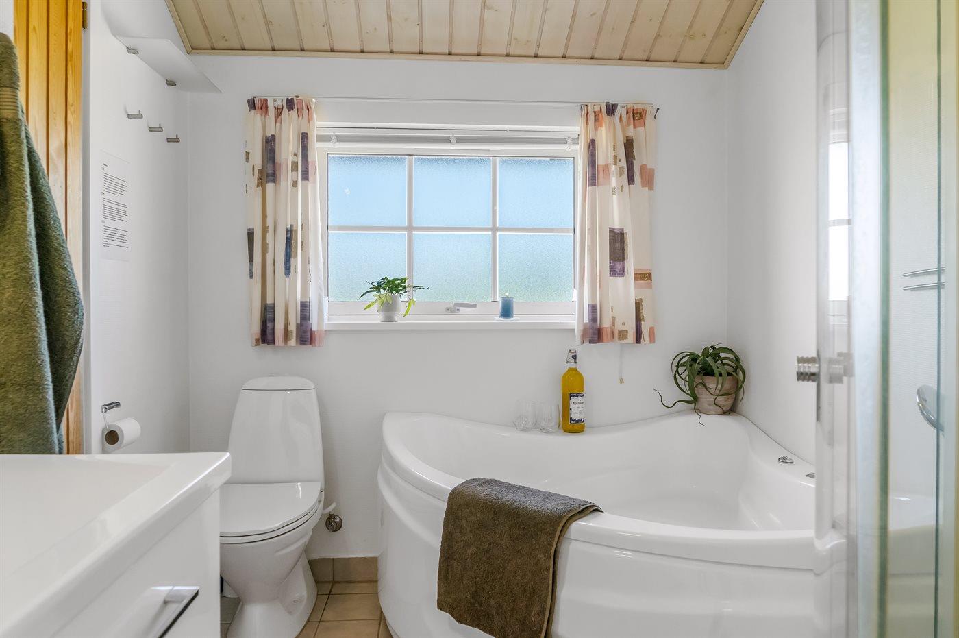 Der er 1 badeværelse med bruseniche og 2 toiletter, heraf 1 gæstetoilet. Der er gulvvarme på 1 badeværelse. I saunaen er der mulighed for afslapning.