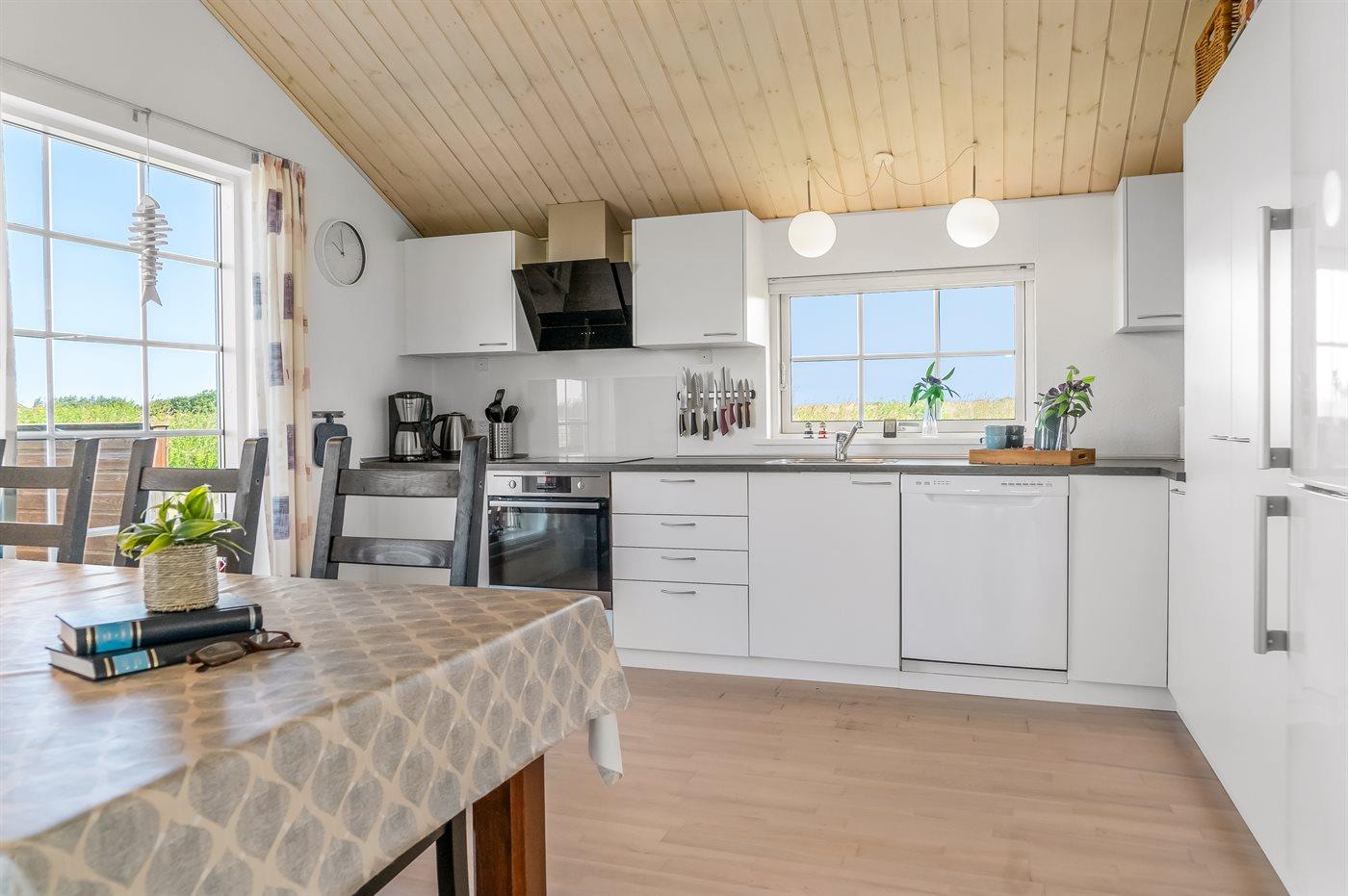 Køkkenet er udstyret med 1 køleskab. Der er 4 keramiske kogeplader, varmluftovn, mikrobølgeovn samt opvaskemaskine.